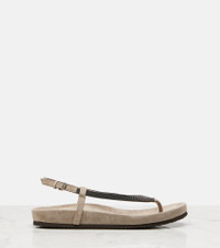 Monili beading is made from nickel-free brass that's faceted to create a sparkling effect and hand-applied to each item. These Brunello Cucinelli thong sandals are made from suede and boast a sleek silhouette, adorned with the signature embellishment on the uppers. Product Details - Upper: leather (suede) - Lining: leather - Sole: leather insole, rubber sole - Toe shape: almond open toe - Made in Italy - Includes: shoe box, dust bag - Designer color name: Roccia - Item color: gray - Item number: P01064445 Size & Fit - True to size - European sizes - 3cm-1" platform (size EU 38) - 4cm-1.5" wedge heel (size EU 38)