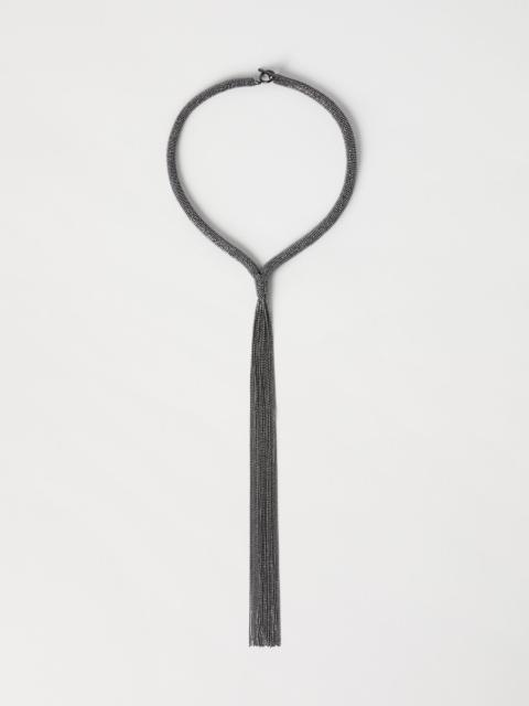 Monili, the iconic element of the Brunello Cucinelli collections, enriches the new necklace with an elegant play of shiny reflections. The tubular necklace is paired with fringe in the center that uses long, fluid rows of monili to create a sparkling contrast of light. MATERIALS Monili, the iconic earmark of the Brunello Cucinelli collections, consists of fine rows of brass beads plated in different finishes. The faceted edge of the beads emphasizes the shiny tones of the monili. All of the metal components are covered with precious materials which completely replace Nickel, enriching the excellence of every single detail. DETAILS Ring and toggle fastening Nickel-free monili decoration Accessory is approx. 54 cm (21.26") BRASS