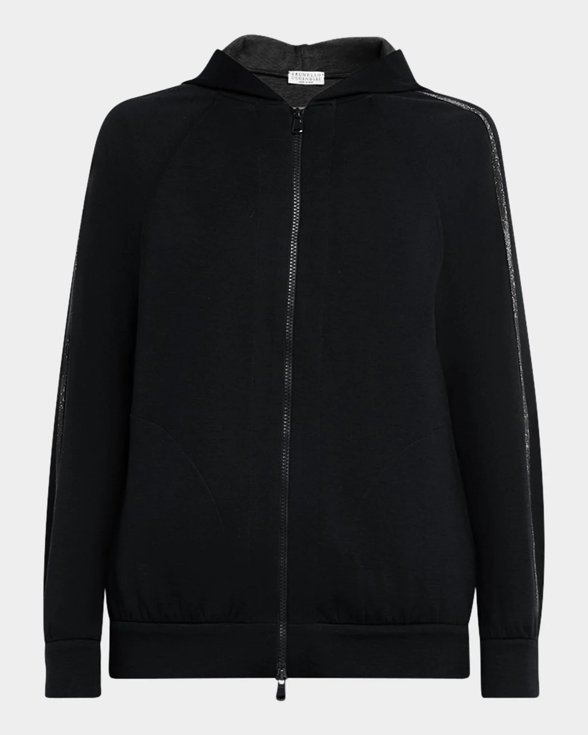 - Brunello Cucinelli sweatshirt featuring monili embellished sleeves and hood - Hooded neckline; two-way zip front - Long raglan sleeves - Side slip pockets - Relaxed fit - Banded cuffs and hem - Cotton/silk/nylon/polyamide - Lining: Silk/acetate - Made in Italy