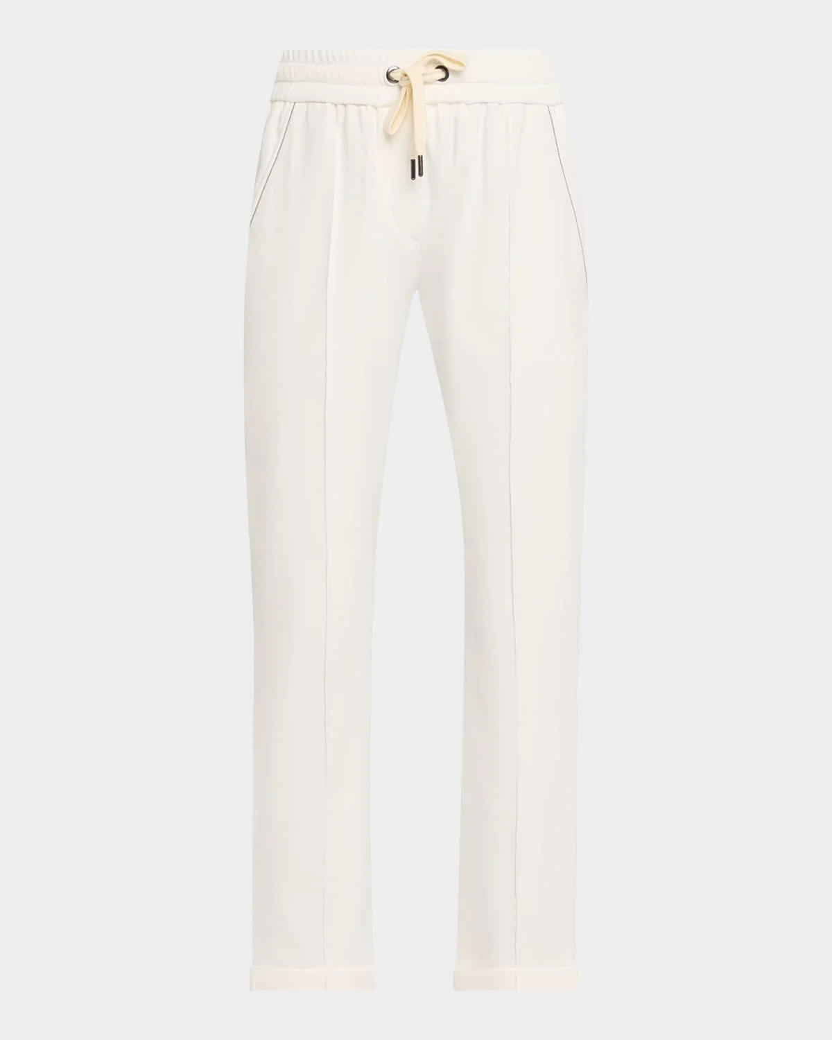 Crafted from cotton stretch, these pants & nbsp;from Brunello Cucinelli feature press creases, an elasticated drawstring waistband, and monili trimmed pockets Mid rise sits high on hip Angled side slip pockets Slim legs Cropped at the ankle Rolled cuffs Pull-on style Cotton/elastane Lining: Acetate/elastane Dry clean Made in Italy SIZE & FITModel measurements: 5 & apos;10" tallModel is wearing a US size 4/Small