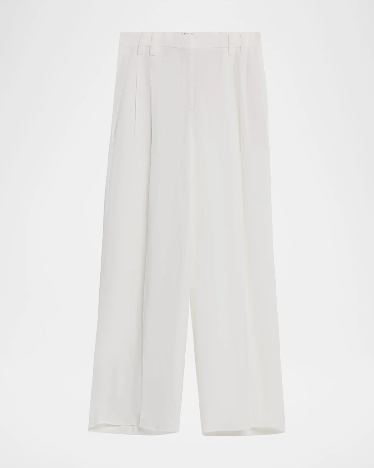 Brunello Cucinelli pants are crafted of linen gabardine with a double pleated front and monili trimmed belt loop on the back High rise Double pleated front Side slip pockets Back patch pockets Wide legs Full length Hook/zip fly; belt loops Viscose/cotton/linen Lining: Polyester/acetate Dry clean Made in Italy