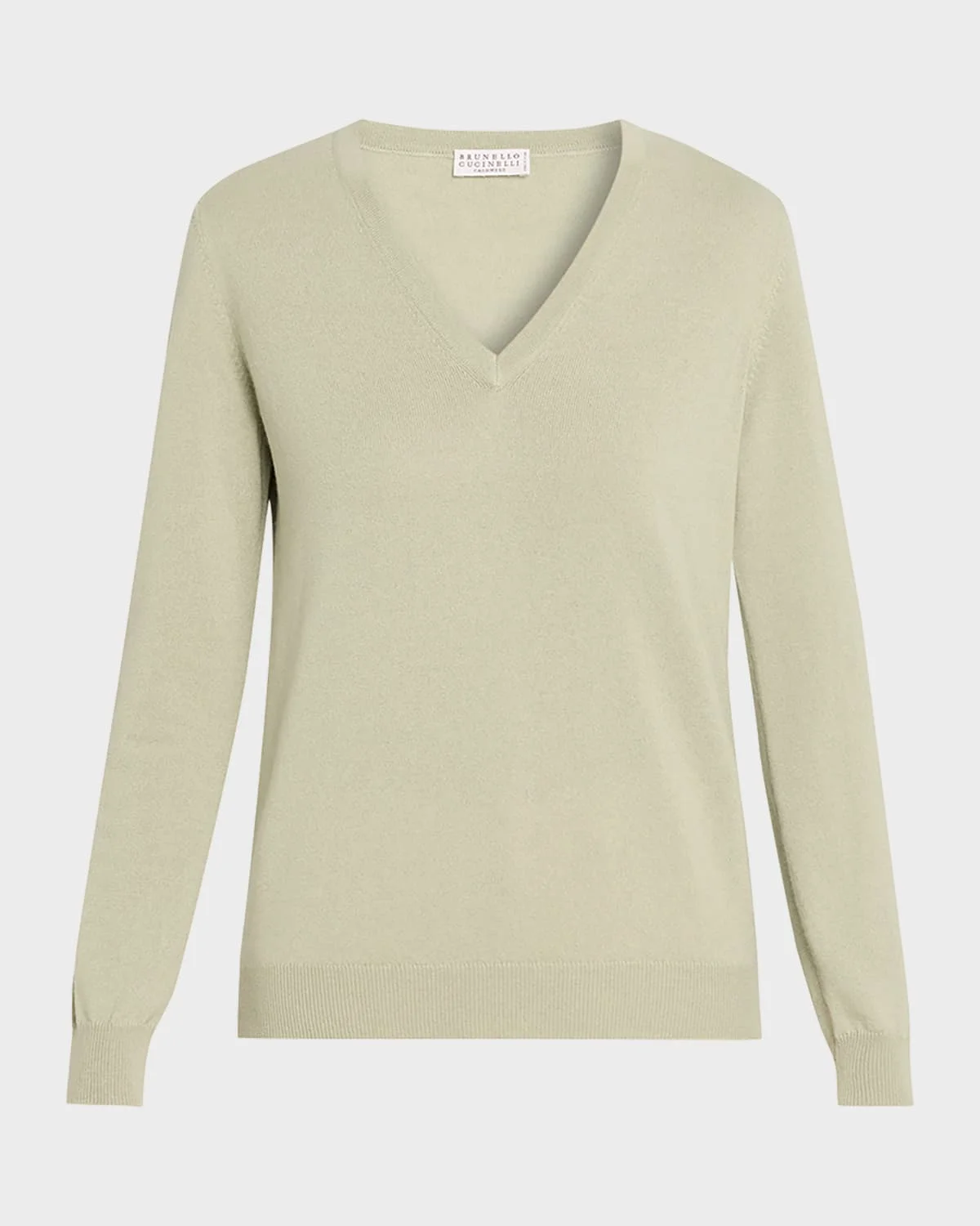 Brunello Cucinelli sweater is crafted from soft cashmere knit accented with monili embellishment on the & nbsp;back of the neck V neckline Long sleeves Relaxed fit Ribbed cuffs and hem Pullover style Cashmere Made in Italy
