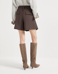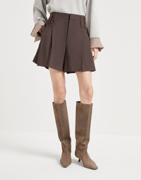 These new Formal shorts showcase classic lines from the world of tailoring. The pleats and the rear welt pockets elevate the garment’s casual attitude, while the distinctly feminine fabric provides a smooth, extremely soft texture. The monili embroidery completes the shorts with a refined sparkling note in true Brunello Cucinelli style. MATERIALS The lightweight fabric combines the virgin wool natural fiber with a percentage of synthetic to provide added comfort. DETAILS Zip closure with metal hooks and backing button Vertical front pockets Double pleat Back welt pocket with flap Rear elastic band Unlined Nickel-free monili decoration 75% VIRGIN WOOL, 23% NYLON, 2% ELASTANE