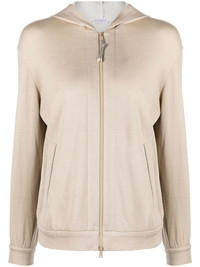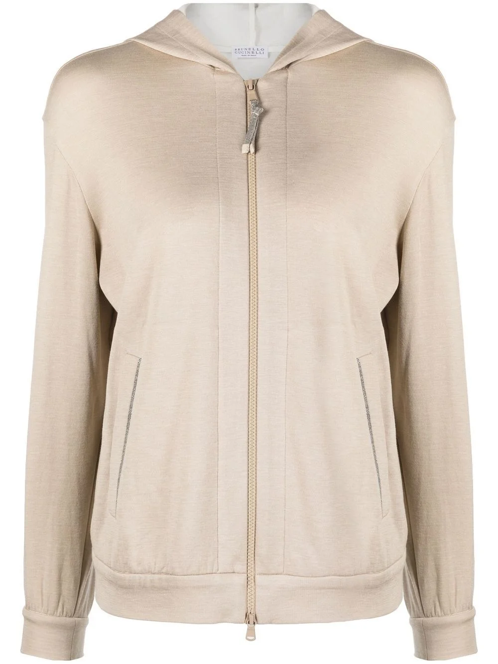 two-pocket zip-up hoodie beige cotton-silk blend classic hood front zip fastening long sleeves fitted-cuff sleeves two side slit pockets straight hem Made in Italy Composition Cotton 67%, Silk 31%, Polyamide 2% SIZE & FIT Model measurements Height 5 ft 10 in(1.79 m) Bust/Chest 31.1 in(79 cm) Hips 35.03 in(89 cm) Waist 24.01 in(61 cm) FittingInformation This piece fits true to size. We recommend you get your regular size Cut for a relaxed fit Made with a mid-weight fabric Washing instructions Hand Wash