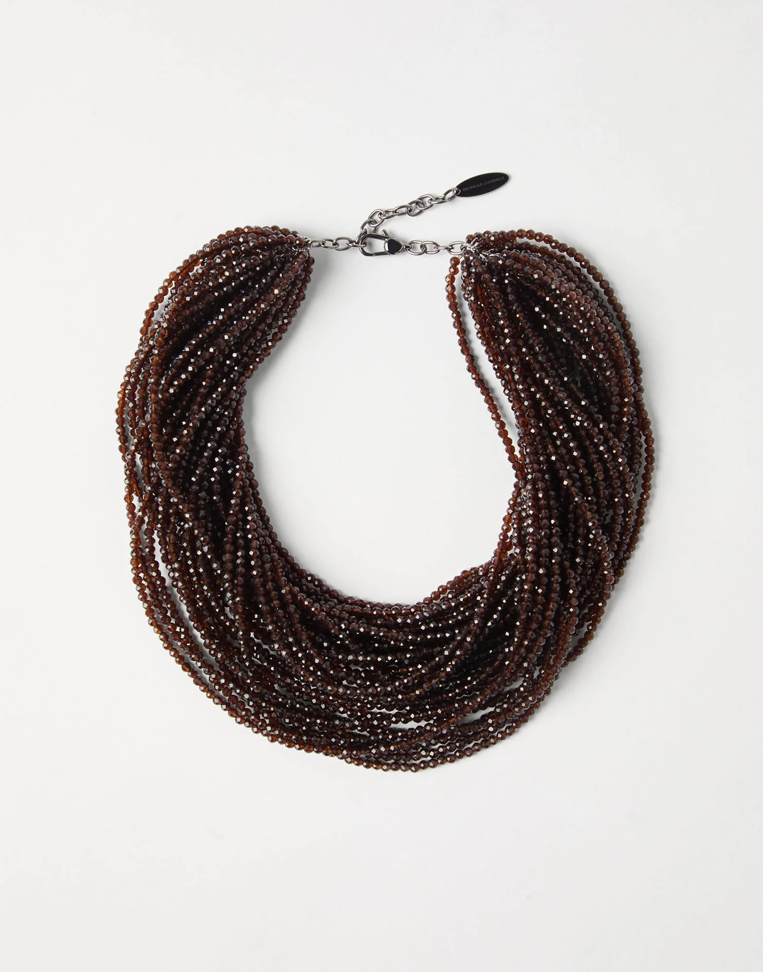 An elegant, feminine design characterizes this new Vetro Brown and 975 Sterling Silver choker necklace. Rows of multifaceted beads, in a warm shade of brown with hints of amber, capture the light and embellish this jewel, that conveys an elegant feel with its essential design. The accessory is complemented by a hook closure that is adjustable to different lengths. MATERIALS The faceted cut of the small Vetro Brown beads meets the natural brightness of Sterling Silver that enhances the accessory’s sheen. DETAILS The maximum length of the open necklace measures approximately 40 cm Adjustable length closure clasp All metal parts are Nickel-free 100% GLASS