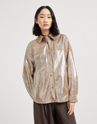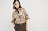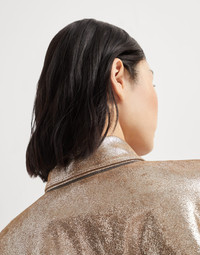 Sophisticated workmanship gives a bold feel to traditional shirting in this new lame nappa shirt. A precious metallic effect with shimmering reflections enriches the entire silhouette, relaxed with slightly dropped shoulders and generous sleeves. The shiny monili embroidery completes the garment with a sparkle in true Brunello Cucinelli style. MATERIALS The refined material, defined by its texture, combines the softness and flexibility of nappa with the shimmering elegance of a lame finish. The reverse side maintains a surface with a velvety hand that is nice to the touch, ensuring maximum comfort when worn. DETAILS Horn snap closure Classic collar Two interior pockets Vertical hand pockets Snap cuffs Nickel-free monili decoration 100% REAL LEATHER