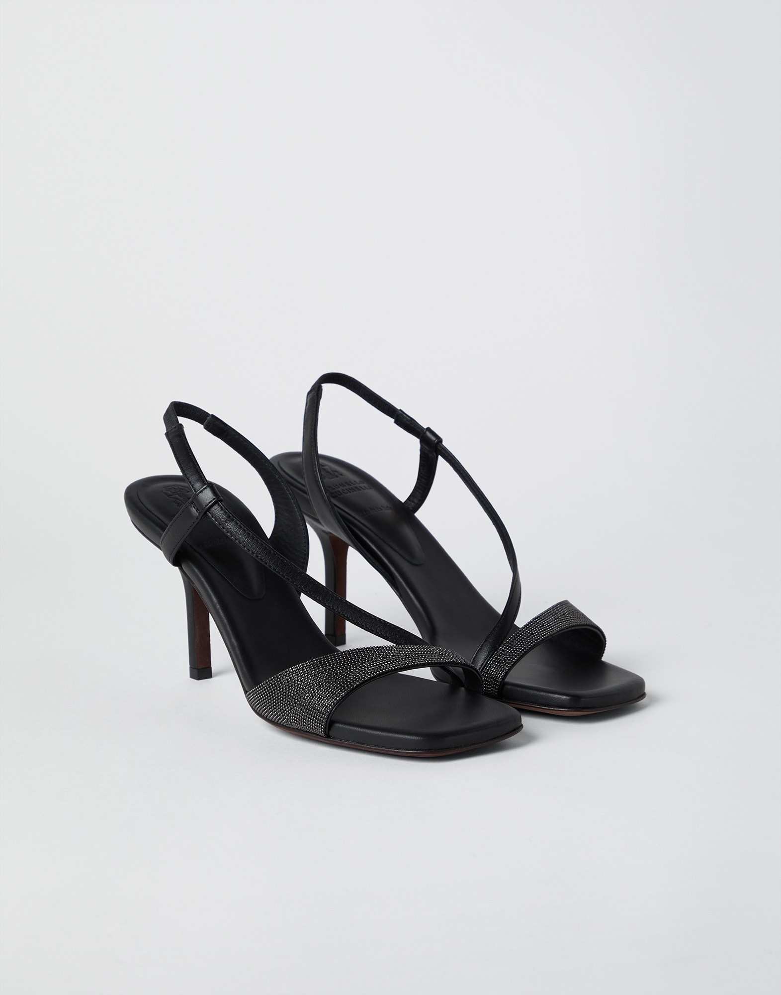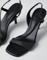 A feminine silhouette is enriched with shiny details to define the design of these new Soft nappa heels. The front strap that hugs the foot is covered in rows of precious monili, the iconic embellishment of the Brunello Cucinelli collections, giving the footwear a radiant sparkle. MATERIALS The nappa leather showcases a natural grain and an extremely soft hand. The leather lining and the TPU rubber islands complete the footwear. DETAILS Rear elastic band Leather lining Leather sole Non-slip TPU rubber at heel and toe 8 cm heel Nickel-free monili decoration Rear elastic band REAL LEATHER