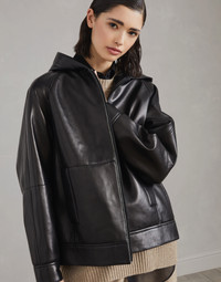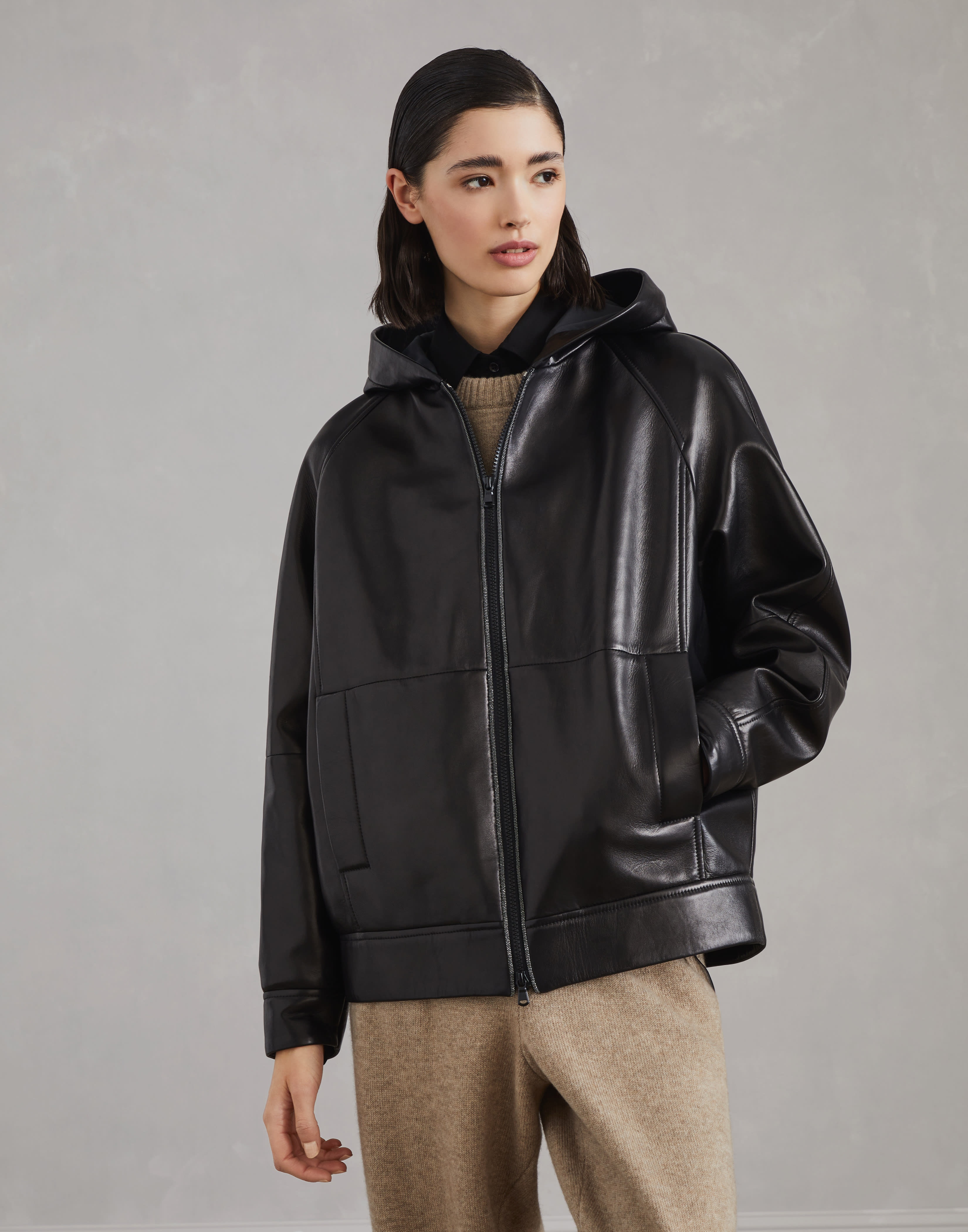 Refined nappa gives this outerwear jacket a distinctly bold, feminine feel. The style features a straight, contemporary silhouette and is completed by a practical hood that is perfect for rainy days. The use of iconic monili along the zipper closure adds a finishing sparkle. MATERIALS Nappa is a very soft, compact and lightweight leather characterized by a very fine grain and a semi-polished look. A silk-blend crêpe lining completes this garment and provides added comfort. DETAILS Two-way zip closure Silk-blend crêpe lining Hood Hand pockets Nickel-free monili decoration REAL LEATHER