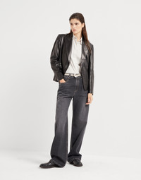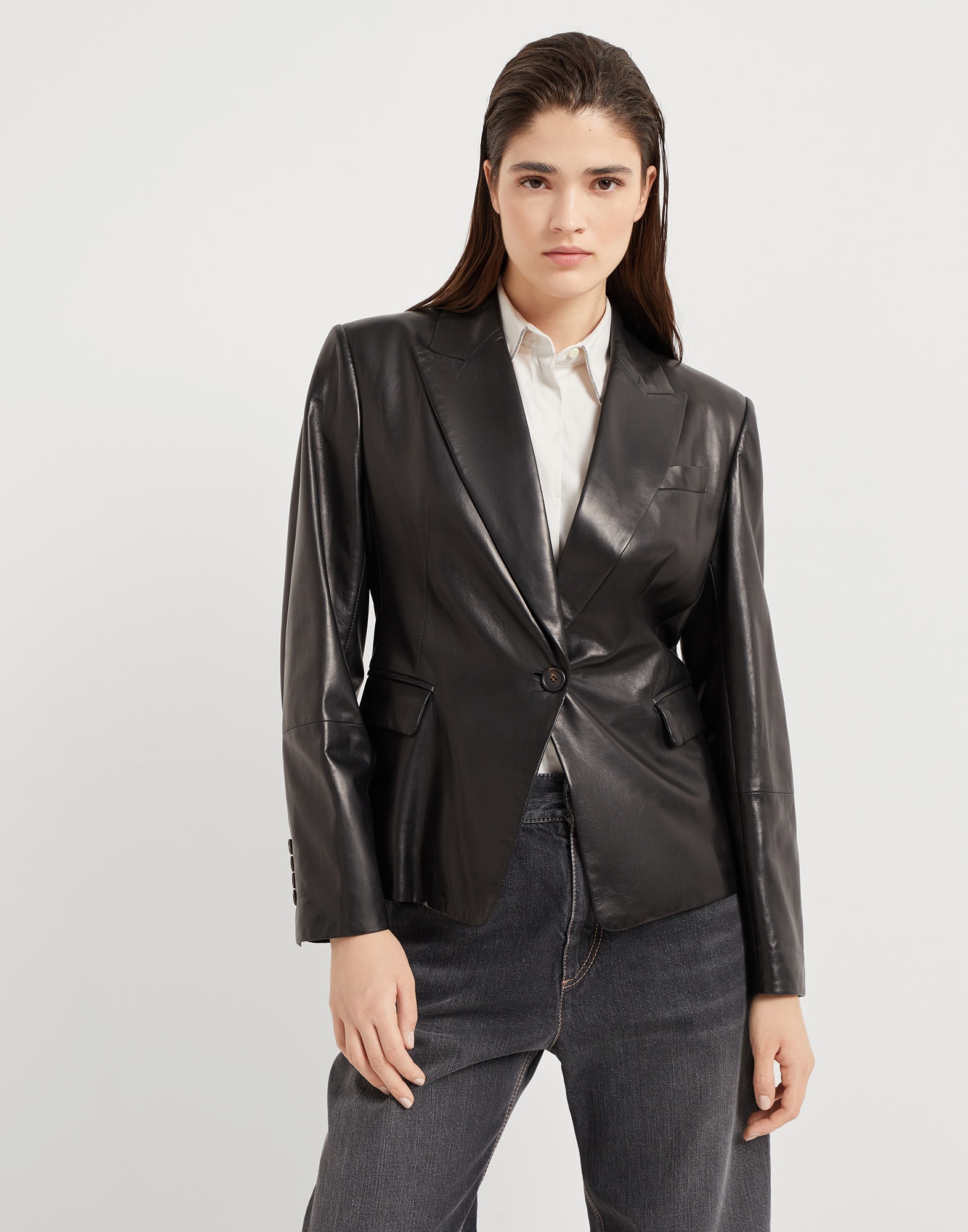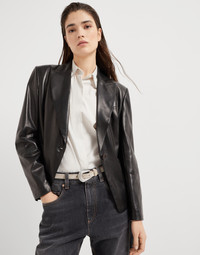 This nappa blazer combines tailored inspiration with a contemporary allure. The style’s classic construction is updated in soft leather, giving the garment a feminine, semi-polished appearance. The monili embroidery, the iconic embellishment of the Brunello Cucinelli collections, adds an unexpected sparkling touch behind the neck. MATERIALS Nappa is a very soft, compact and lightweight leather characterized by a very fine grain and a semi-polished look. The dye in the season’s colors spreads an intense, even hue. DETAILS Horn button closure Silk-blend crepe lining Welt pockets with flap and chest pocket Cuffs have four horn buttons Peak lapel Nickel-free monili decoration REAL LEATHER
