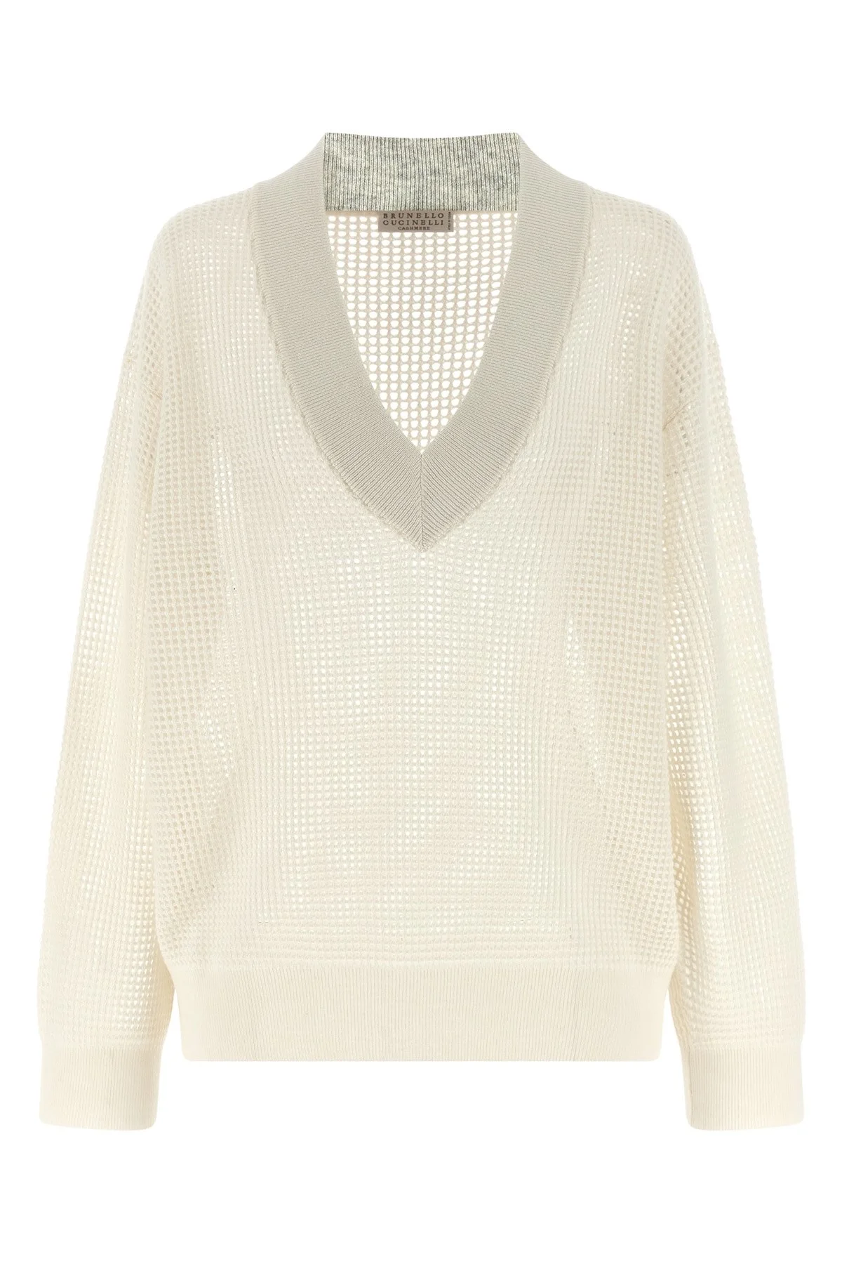 cod. M12205102CO312 Mesh cashmere sweater, relaxed silhouette, V-neck, long sleeves with cuffs and dropped shoulders, band on the hem. Color: White Size & Fit: Comfort fit Composition: 100% cashmere Made in: Italy