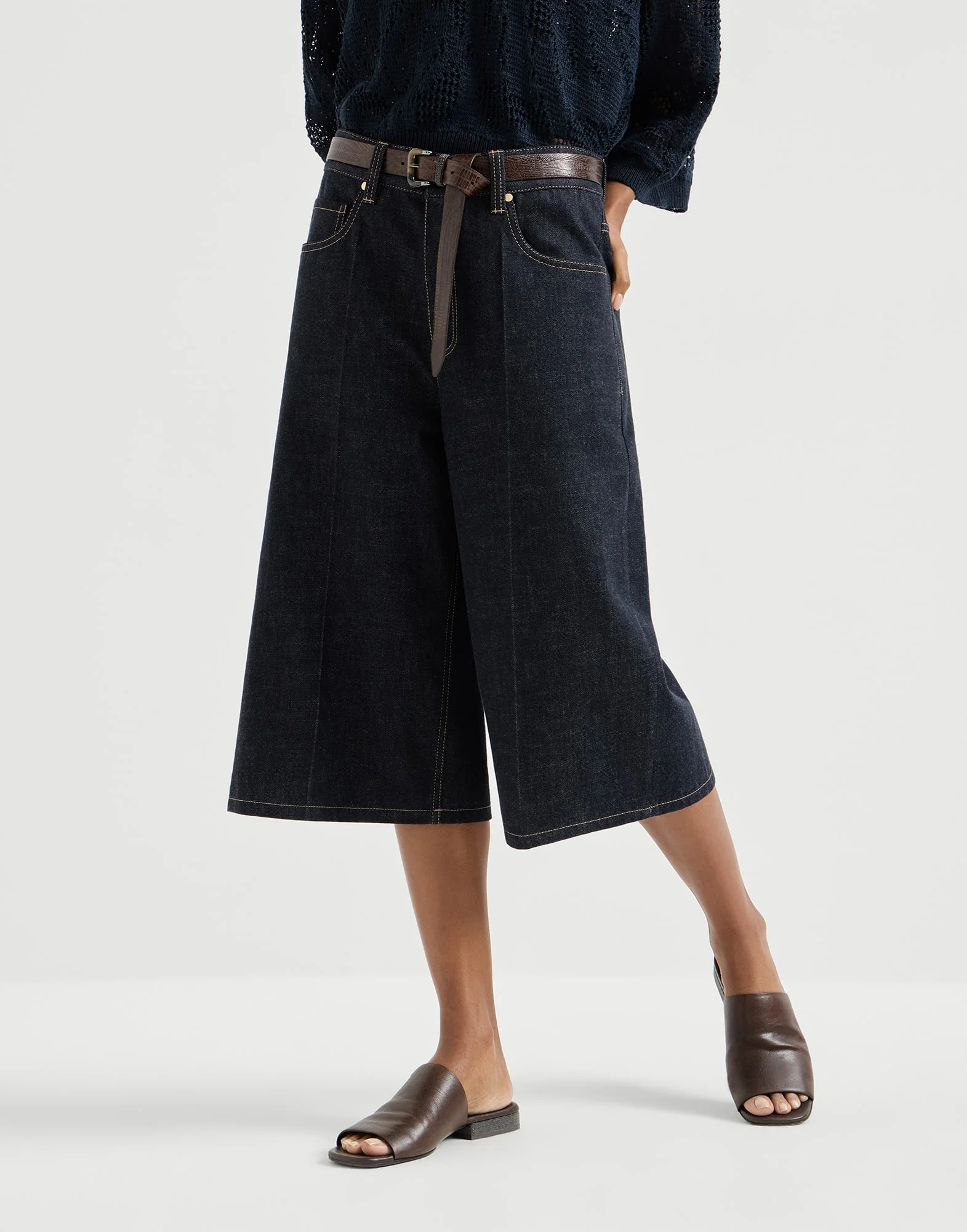 Informal volume and shimmering elements come together in these no-fade denim long Bermuda shorts. The no-fade fabric conveys a casual yet very sophisticated feel, while the regular fit in the hips develops wide and flared. The precious monili embroidery adds a feminine sparkle in true Brunello Cucinelli style. MATERIALS The pure cotton denim is characterized by a lightweight texture and a dark color that does not lighten after washing. DETAILS Zip closure with button Front pockets with watch pocket Back patch pockets Plain hem Nickel-free monili decoration 100% COTTON