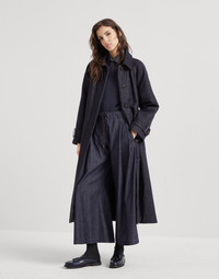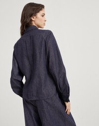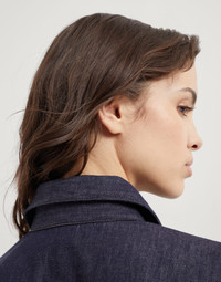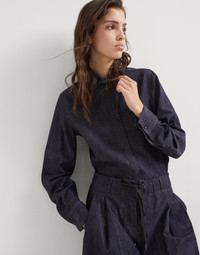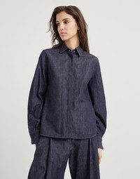 The unmistakable character of no-fade denim is paired with feminine lines and details in this shirt. Almost hidden, the distinct embellishment of the Brunello Cucinelli collections is showcased behind the neck: a fine embroidery of shiny monili that gives the garment a precious touch. The slightly tapered lines to the body and the volume of the sleeves complete the shirt’s comfortable fit. MATERIALS The soft cotton denim is characterized by a delicate, slightly uneven color achieved with a special dyeing process involving different stages. Thanks to this process, the fabric takes on a subtle mottled effect designed to last over time, without losing its original depth. DETAILS Concealed button closure Classic collar Cuffs have one mother of pearl button Nickel-free monili decoration 100% COTTON