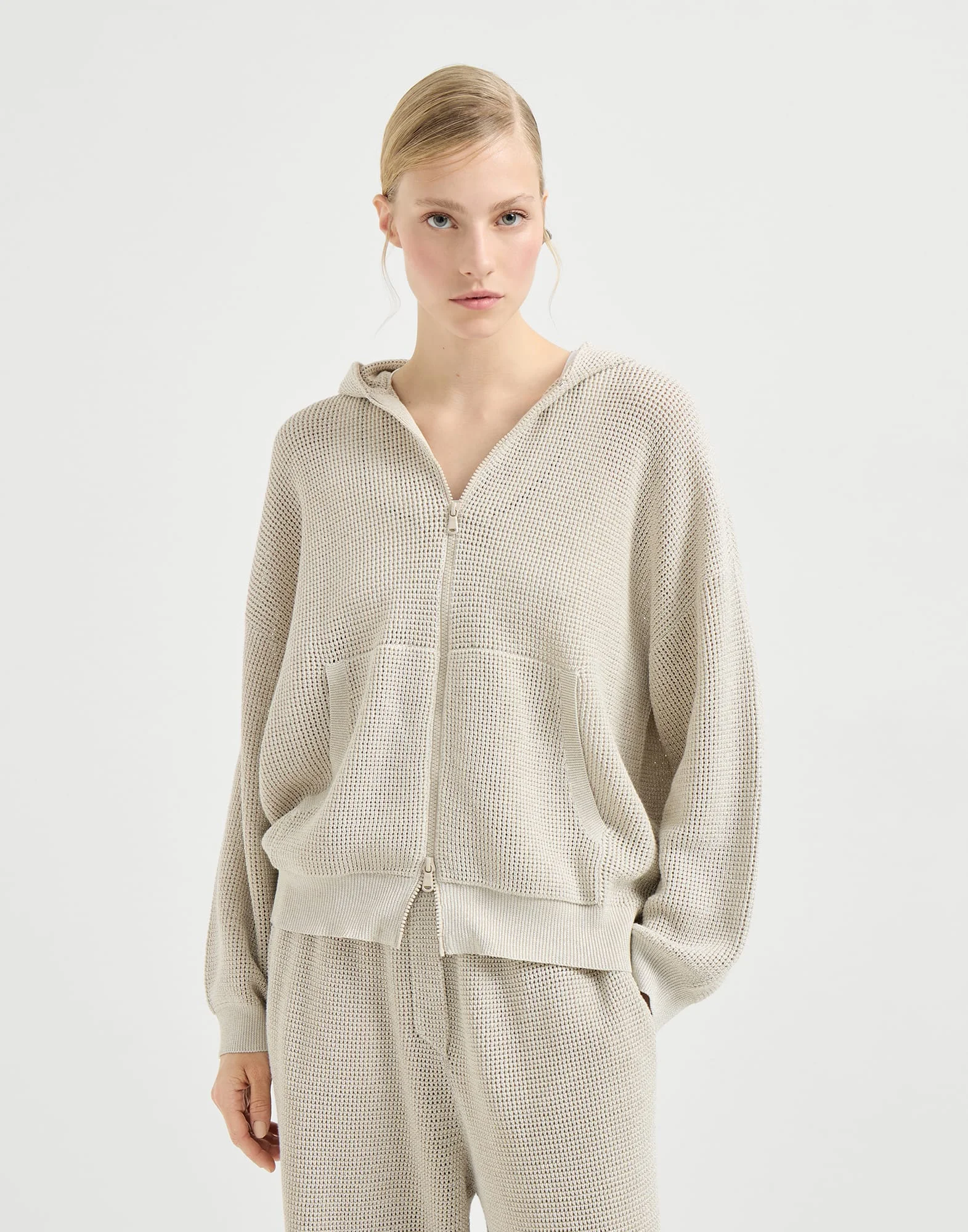 Shimmering details elevate the sporty style of this cotton sparkling net hooded cardigan. The reflections of the lame thread stand out on the garment’s soft surface, giving the design an elegant, feminine glow. The hood and hand pockets convey a distinctly casual feel. MATERIALS The cotton yarn is soft, lightweight and breathable, making it ideal for summer and spring garments. The lame thread enriches the surface with delicate reflections. DETAILS Two-way zip closure Hood Drop shoulder Rib knit cuffs and bottom band Vertical hand pockets 79% COTTON, 16% VISCOSE, 5% POLYESTER