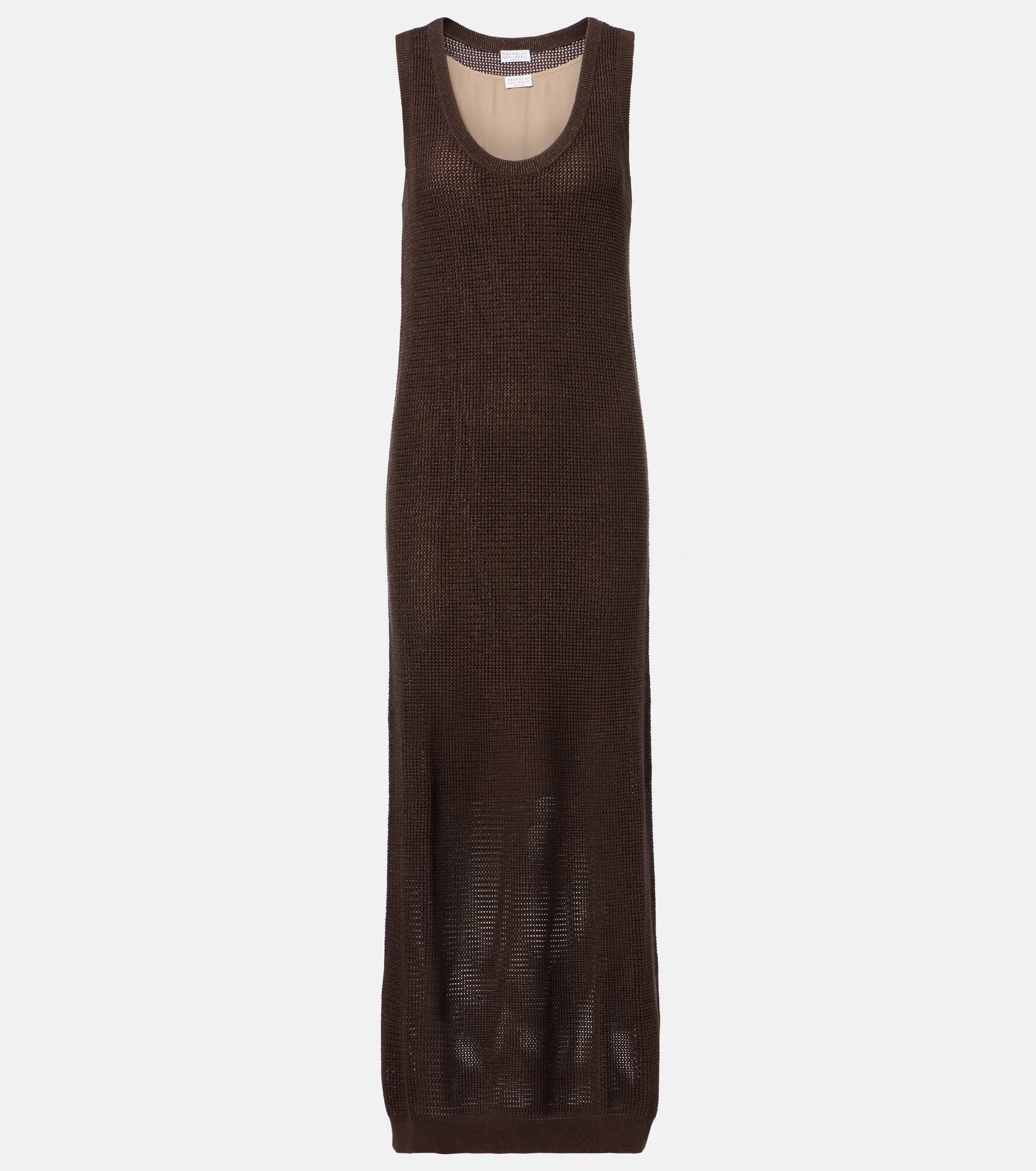 Brunello Cucinelli's designs are created in Solomeo, a medieval hamlet whose art and traditions are woven into the house's every fiber. This maxi dress is made from a soft cotton blend with an open-knit finish. Product Details - Material: 79% cotton, 16% viscose, 5% polyester - Care instructions: hand wash - Made in Italy - Designer color name: Dark Brown/Chocolate - Item color: brown - Material II: 74% acetate, 26% silk - Two-piece set - Item number: P01143573 Size & Fit - True to size - Straight fit - Slightly stretchy fabric - The model seen in the picture is 178cm-5'10" and wearing a size XS