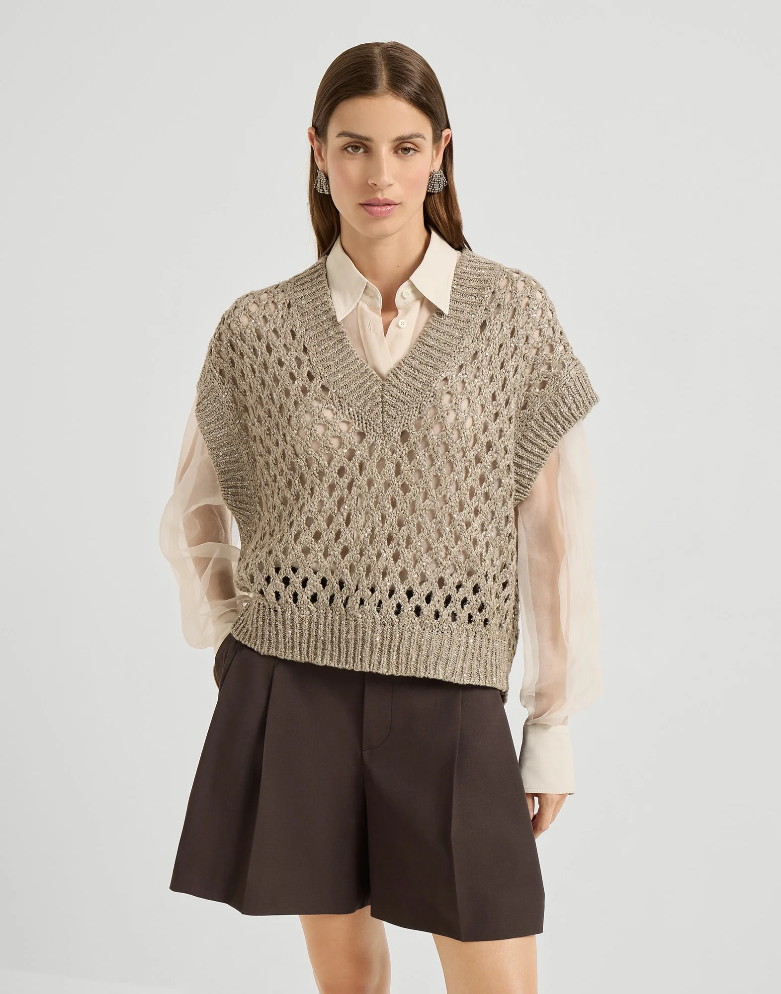 The combination of refined craftsmanship and contemporary lines defines the style of the new Dazzling Net top. The lightweight linen and silk yarn is crafted with a special net stitch to create a regular geometric pattern of open and filled spaces. Finally, the small sequins running through the yarn add a luminous and feminine touch, while the relaxed lines give the garment a contemporary attitude. MATERIALS The fine linen and silk yarn stands out for its slightly irregular hand, which lends the texture a refined, authentic feel. The entire surface is delicately illuminated by small sequins, adding a touch of sophisticated and feminine sparkle. DETAILS Crew-neck Drop shoulder Wide sleeve Net knitting 36% SILK, 34% LINEN, 17% NYLON, 13% POLYESTER