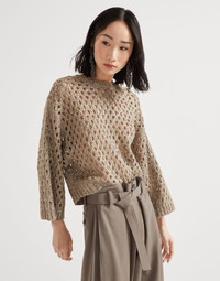 Precious, feminine craftsmanship characterizes this silk and cotton Dazzling Net sweater. The iconic net-like knitting is paired with the shiny effect of the sequins which enrich the garment’s surface with delicate sparkling reflections. The rib knit edges complete the style of the sweater. MATERIALS The yarn is characterized by a combination of silk and linen which gives life to garments with a rustic yet sophisticated effect. The addition of a cotton yarn with sequins enriches the refined natural fibers with intense sparkling reflections. DETAILS Crew-neck Drop shoulder Wide sleeve Net knitting 36% SILK, 34% LINEN, 17% NYLON, 13% POLYESTER