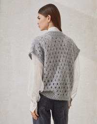 Skillful manufacturing techniques and precious materials enrich this Wispy wool and mohair Dazzling Net vest. The classic net stitch knitting, which plays with solid and empty spaces, is enriched with the shiny touch of small sequins that spread delicate radiant reflections throughout the garment’s surface. The rib knit edges and V-neck complement the design. MATERIALS The Wispy wool and mohair yarn is characterized by a lightweight and airy texture with a fluffy and soft look that enhances the qualities of the natural fibers. A fine thread embellished with sparkling sequins spreads precious reflections across the surface of the garment. DETAILS V-neck Drop shoulder Net knitting 54% MOHAIR, 26% NYLON, 15% POLYESTER, 5% WOOL