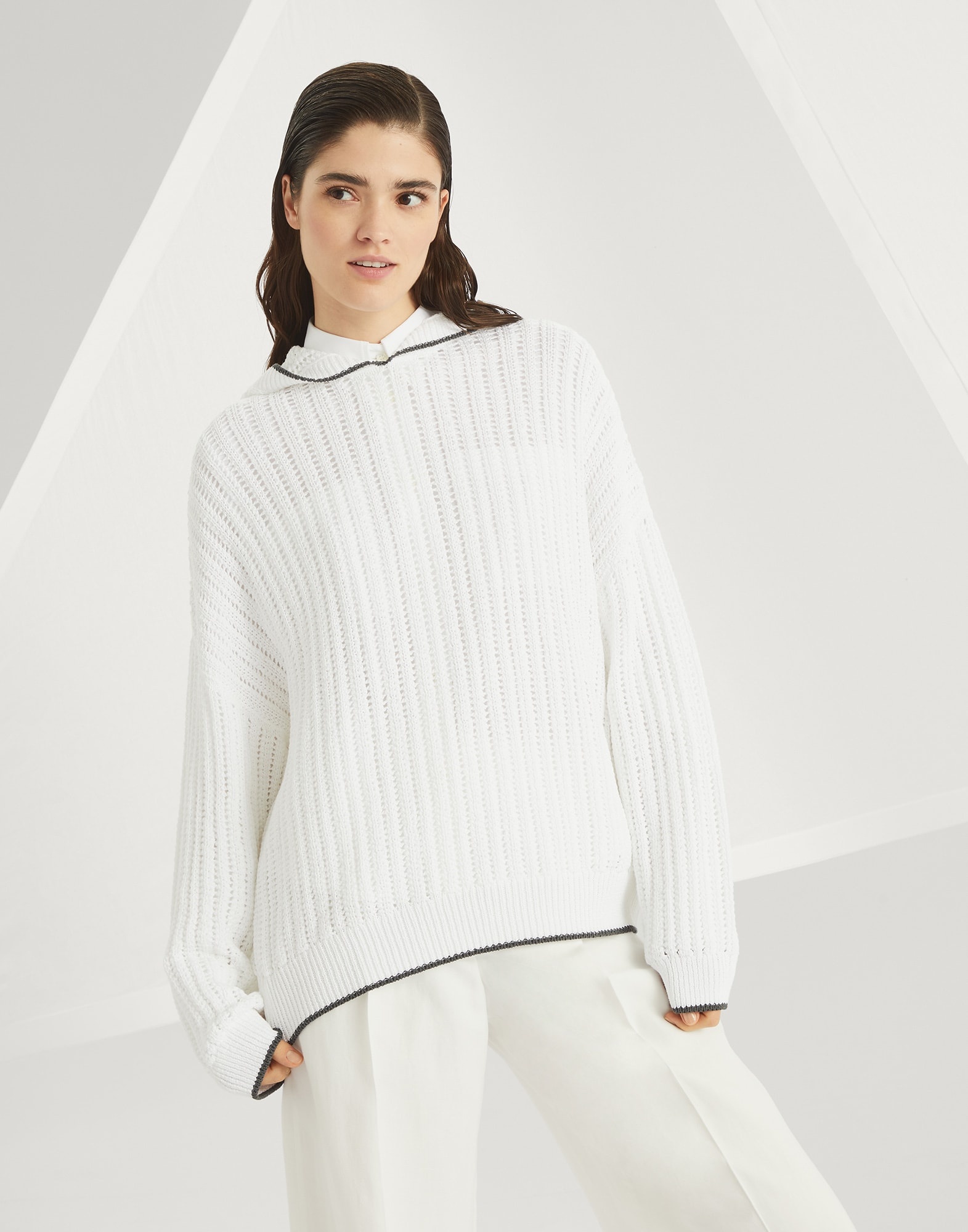Traditional workmanship and precious details elevate the summery feel of this cotton sweater. With a clean, essential nature, ribbed openwork enriches the cotton yarn, giving the garment a light, airy appearance. The contrasting insert along the edge of the hood and the bottom band completes the garment with an activewear-inspired element, while the precious monili detail adds a feminine sparkle in true Brunello Cucinelli style. MATERIALS The cotton yarn is soft, lightweight and breathable, making it ideal for summer and spring garments. The compact fiber maintains the design’s geometric net-like structure, providing a nice sensation when worn. DETAILS Hood Drop shoulder Wide sleeve Various knit stitches 100% COTTON