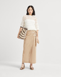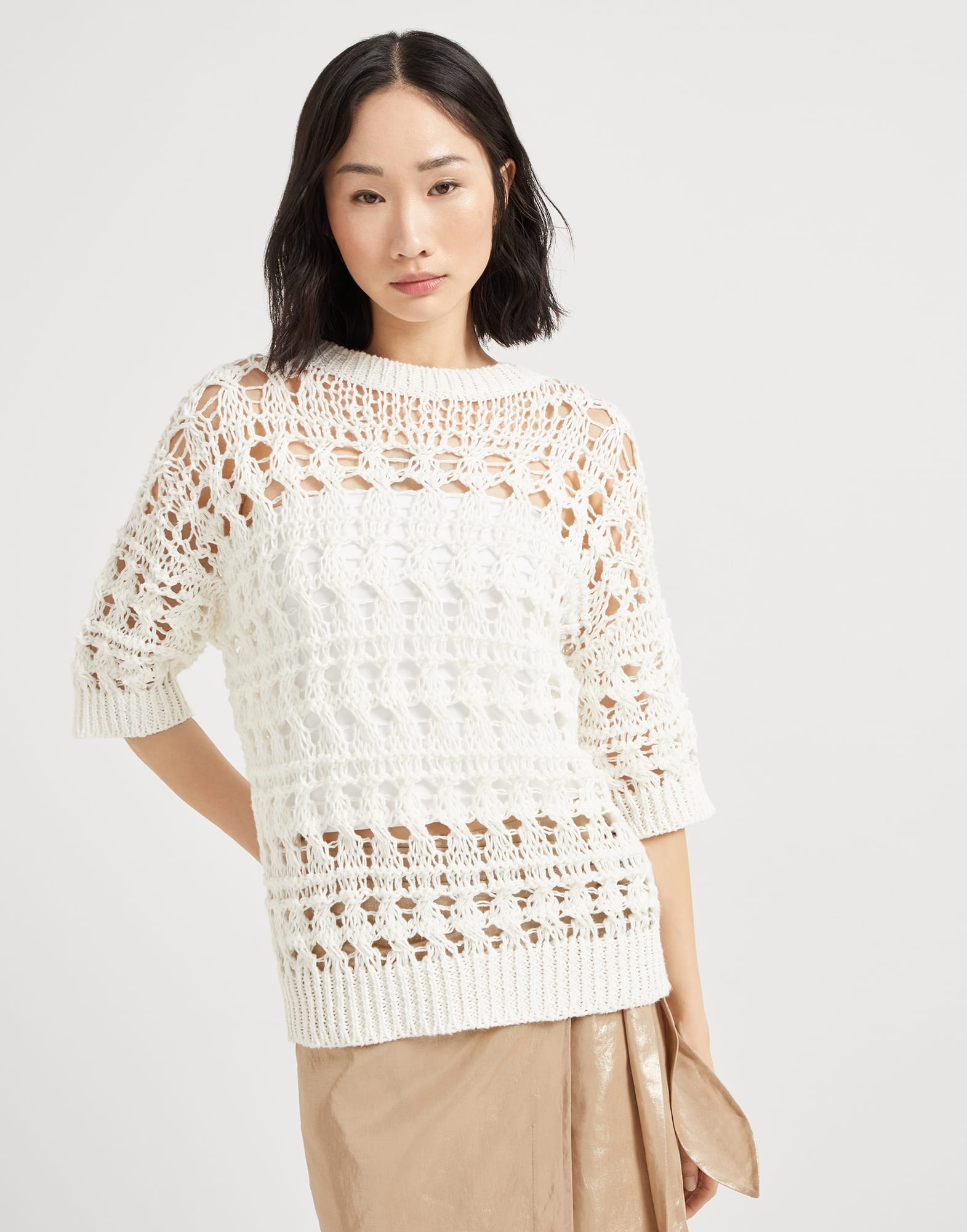 Made of natural jute and cotton fibers, this sweater is defined by the authentic allure of its refined textured net knitting. The sophisticated net stitch plays with solid and empty spaces with a three-dimensional appearance, enhancing the design’s lightness. The regular silhouette is completed by a classic ribbed crew-neck and three quarter sleeves. MATERIALS With a light, soft texture, the yarn is defined by the blend of jute and cotton fibers. A small percentage of a synthetic fiber guarantees the yarn’s durability and structure. DETAILS Crew-neck Drop shoulder Wide sleeve Net knitting 55% JUTE, 35% COTTON, 10% NYLON