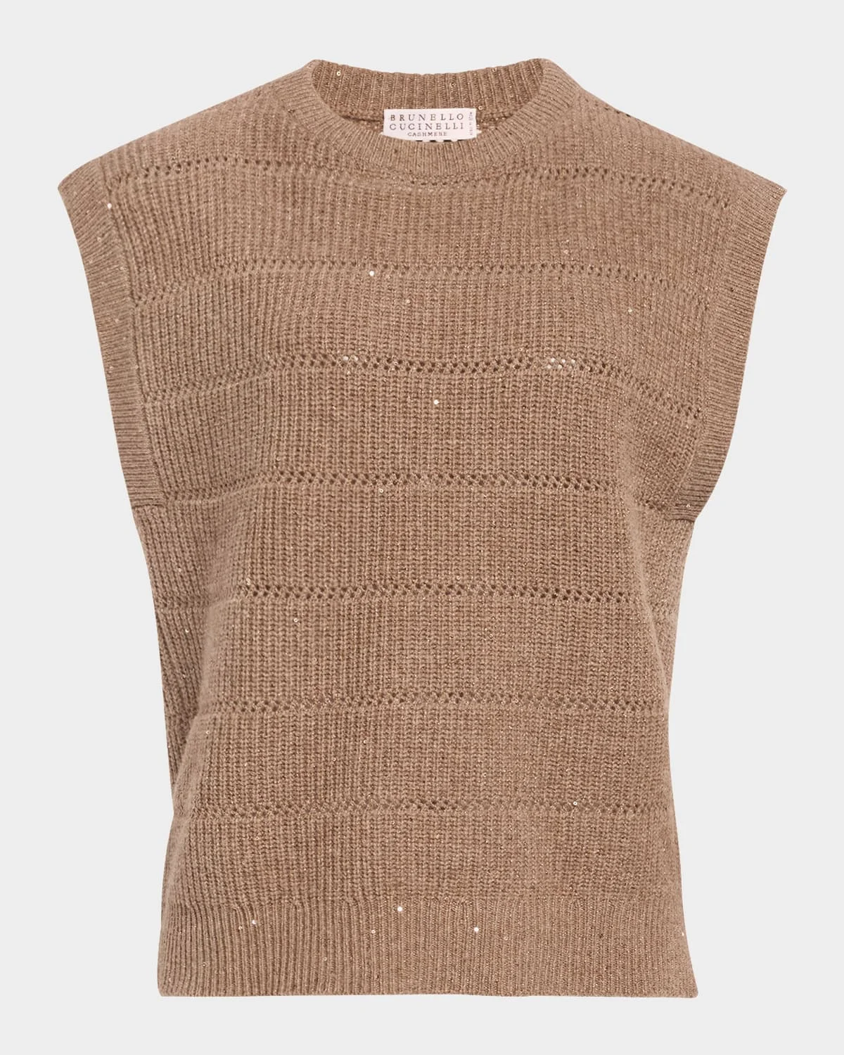 - Delicate openwork stripes trace the front of this Brunello Cucinelli knit top, embroidered with paillettes for a play of texture and shine - Style it over a tailored poplin shirt or alongside a suede vest to enhance depth - Crew neckline - Cap sleeves - Pullover style - Relaxed fit - Cashmere/wool/nylon/polyamide - Made in Italy