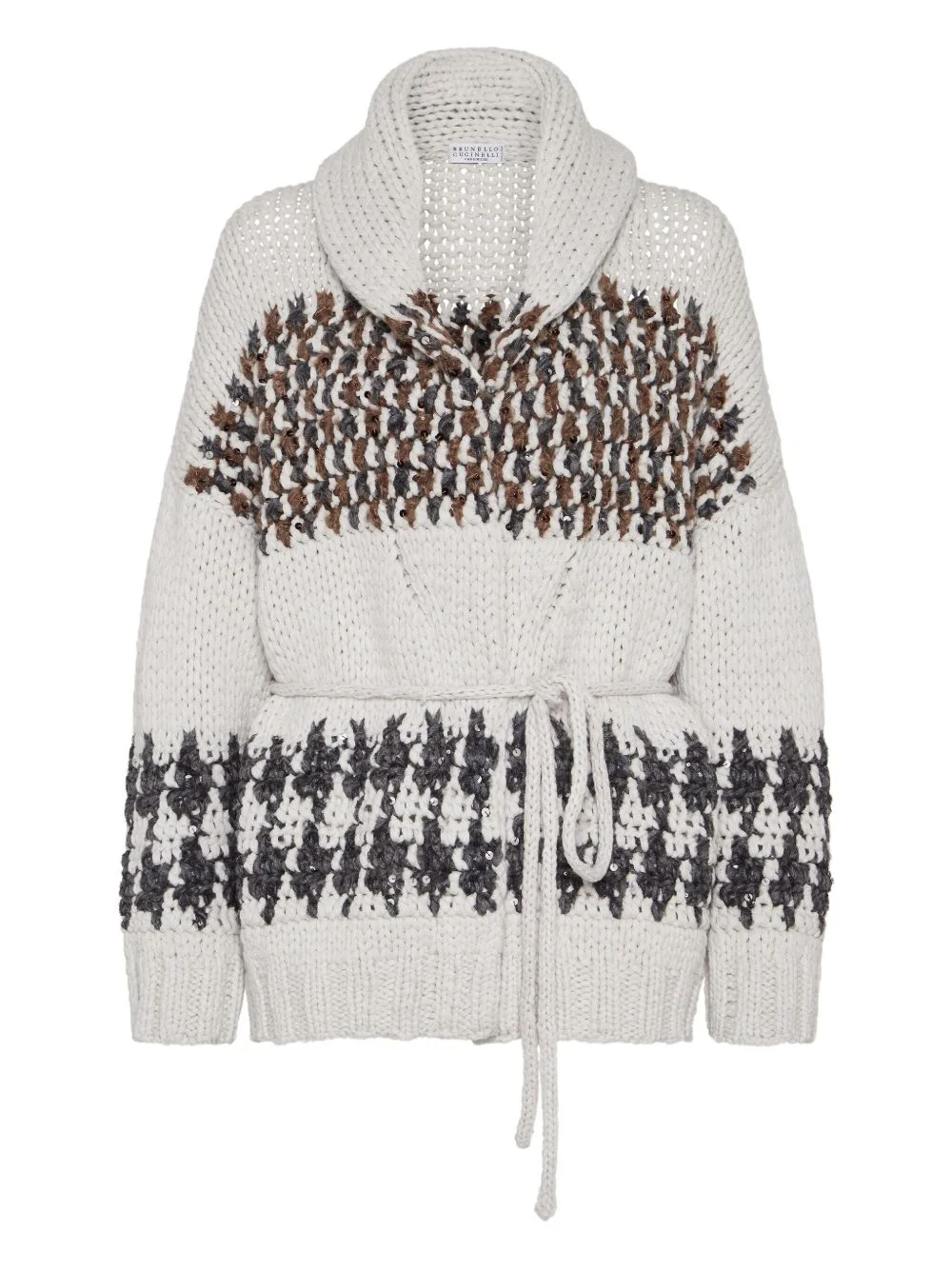 shawl-lapels cardigan Highlights - Beige - Shawl lapels - Belted waist - Sequin embellishment Made in Italy Composition Cashmere 100% Washing instructions Read Manufacturer Guidelines