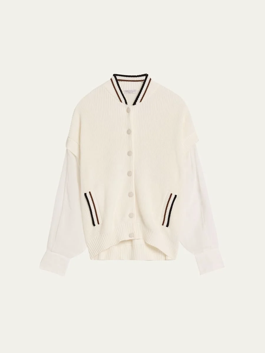 Brunello Cucinelli cardigan is crafted from cotton English ribbed knit accented with a contrasting varsity striped collar and cotton organza sleeves Baseball collar; snapbutton front Long sleeves; button cuffs Hip welt pockets Loose fit Ribbed hem Cotton Dry clean Made in Italy
