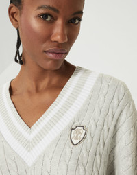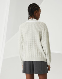 Relaxed lines and a sporty attitude meet fine Brunello Cucinelli yarns in this cotton sweater. Classic cable knitting gives the garment a three-dimensional look and enhances the softness of the yarn, while the contrasting insert on the V-neck adds an Active element to the design. The Solomeo heraldic coat of arms stands out on the chest, complementing the sweater with an iconic detail. MATERIALS The cotton yarn is soft, lightweight and breathable, making it ideal for summer and spring garments. DETAILS V-neck Drop shoulder Wide sleeve Cable knit 100% COTTON