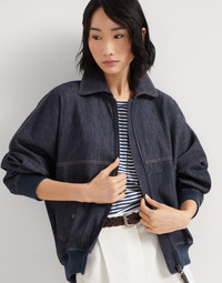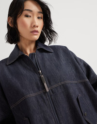 A contemporary silhouette defines the casual attitude of this new denim-like twill bomber jacket. With its metropolitan feel, the fabric enhances the informal look of the garment, which features contrasting stitching typical of classic denim trousers. The silhouette offers comfortable proportions with slightly dropped shoulders and elasticized ribbed trim, while the precious monili embroidery on the zipper pull introduces a touch of feminine sparkle in true Brunello Cucinelli style. MATERIALS Characterized by a look reminiscent of classic denim, the pure cotton twill is a lightweight, comfortable fabric, suitable for wearing during the warmer months. DETAILS Two-way zip closure Unlined Hand pockets with snap Nickel-free monili decoration 100% COTTON