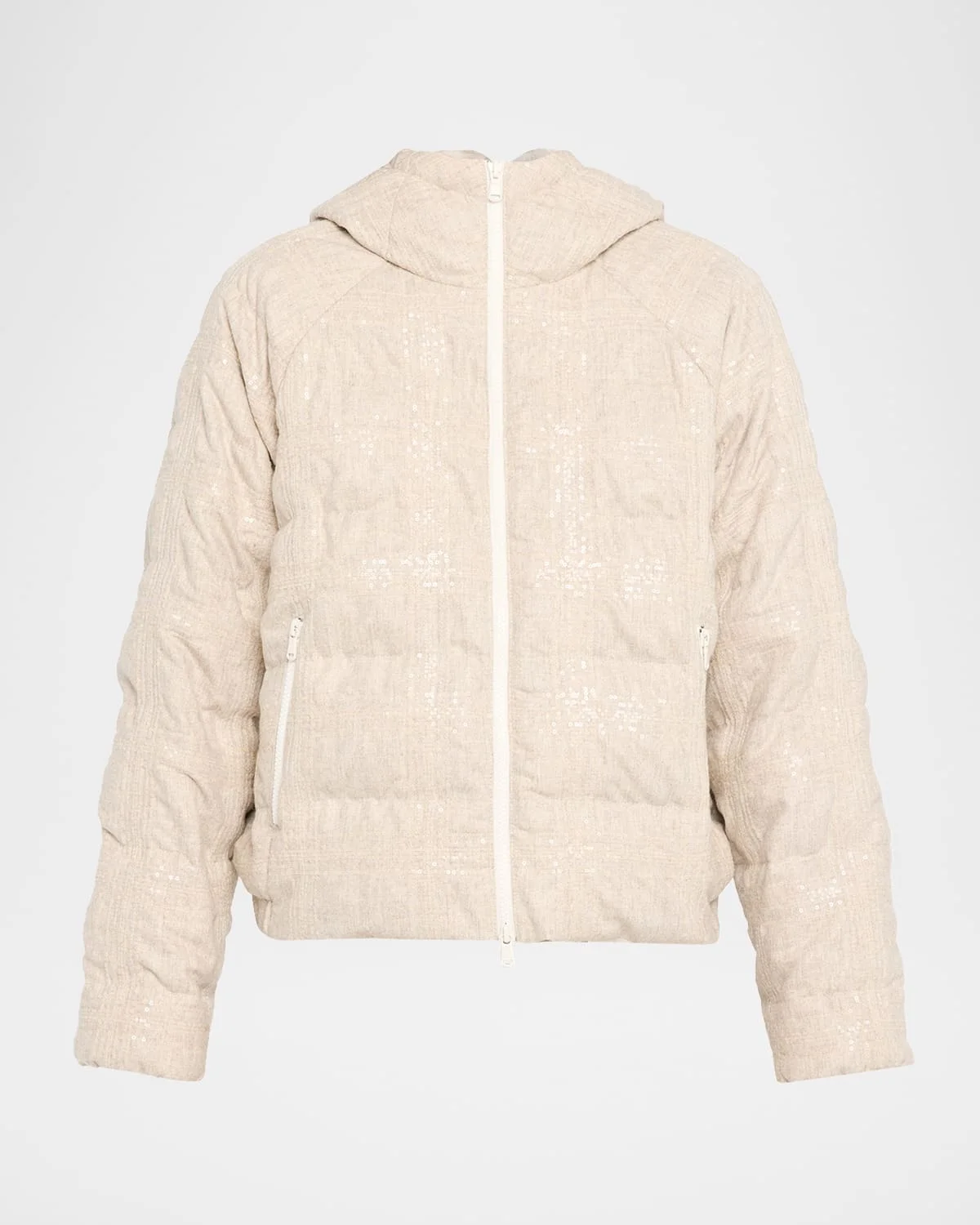 Brunello Cucinelli padded jacket is crafted of wool flannel embellished with Paillette embroidered Prince of Wales check Hooded neckline; twoway zip front Long raglan sleeves Hip zip pockets Relaxed fit Hip length Elasticized hem Virgin wool Fill: Polyester Made in Italy