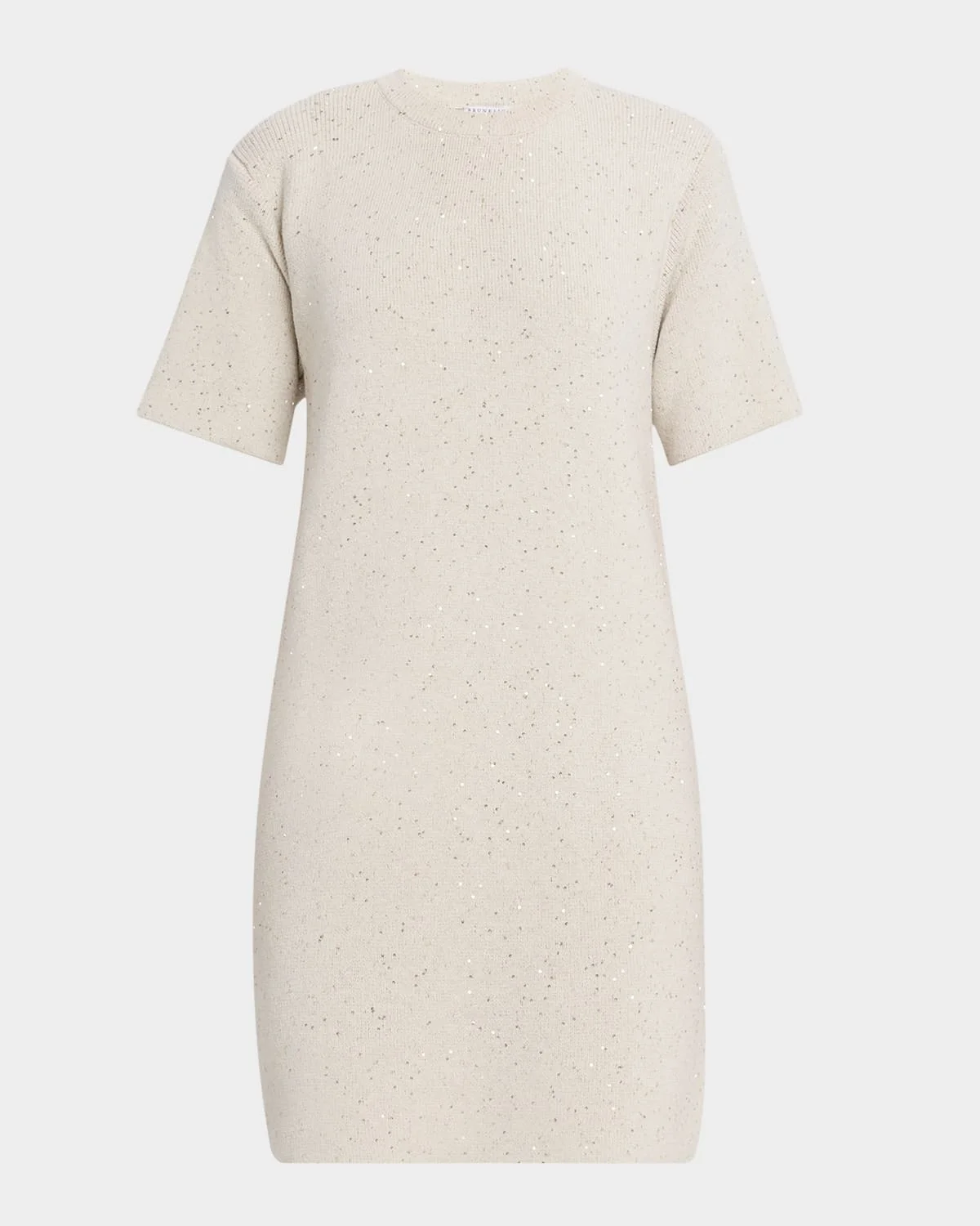 Brunello Cucinelli dress is crafted of a linencotton paillette knit that subtly shimmers with every step Round neckline Short sleeves Shift silhouette Midthigh length Slipover style Cotton/polyester Made in Italy