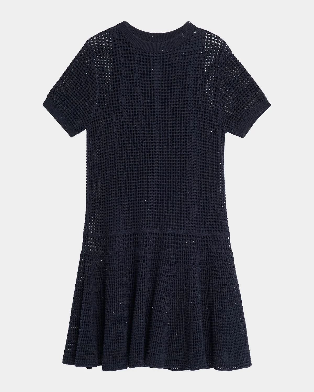 Pailette Open Knit Drop-Waist Short-Sleeve Mini Dress