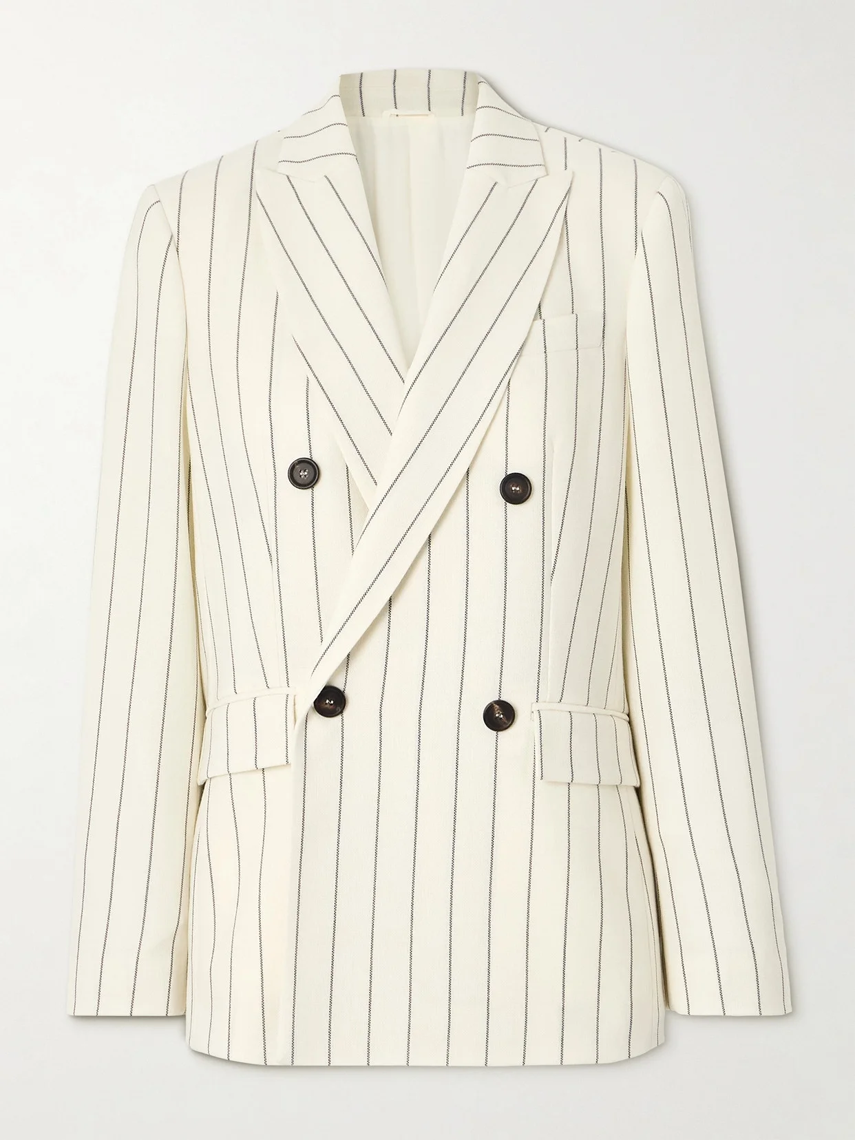 You'll look and feel so polished whenever you pull on this Brunello Cucinelli blazer. Made from grain de poudre wool patterned with pinstripes, it's cut in a double-breasted profile and framed with sharp shoulders. Style it with tailored culottes or pants.