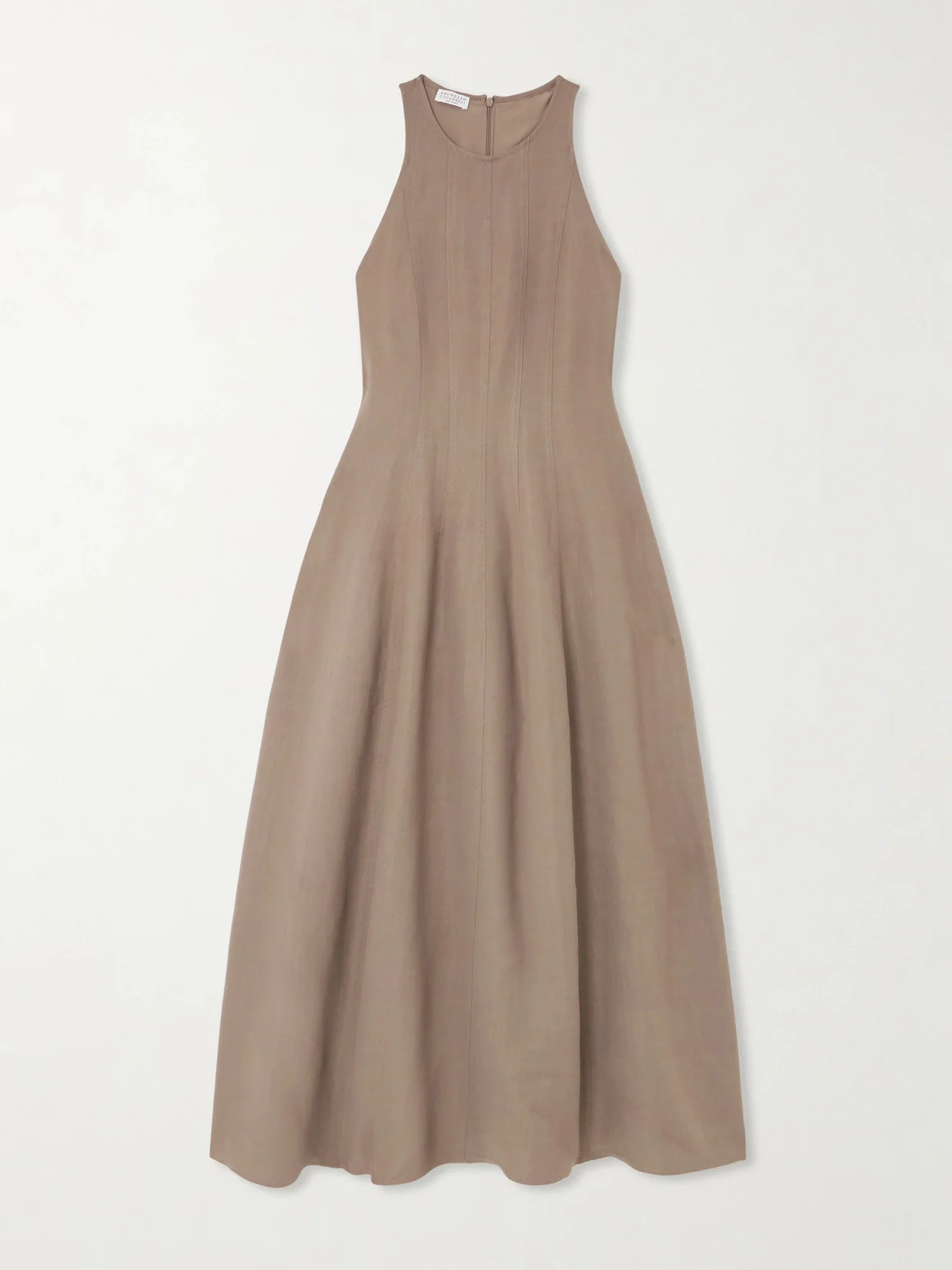 Brunello Cucinelli's dress is cut from panels of twill that meet at subtle seams along the fitted bodice. It's designed to nip in at the waist before gently flaring out to a floaty, softly pleated skirt and has a high neckline. Wear yours with flats or heels.