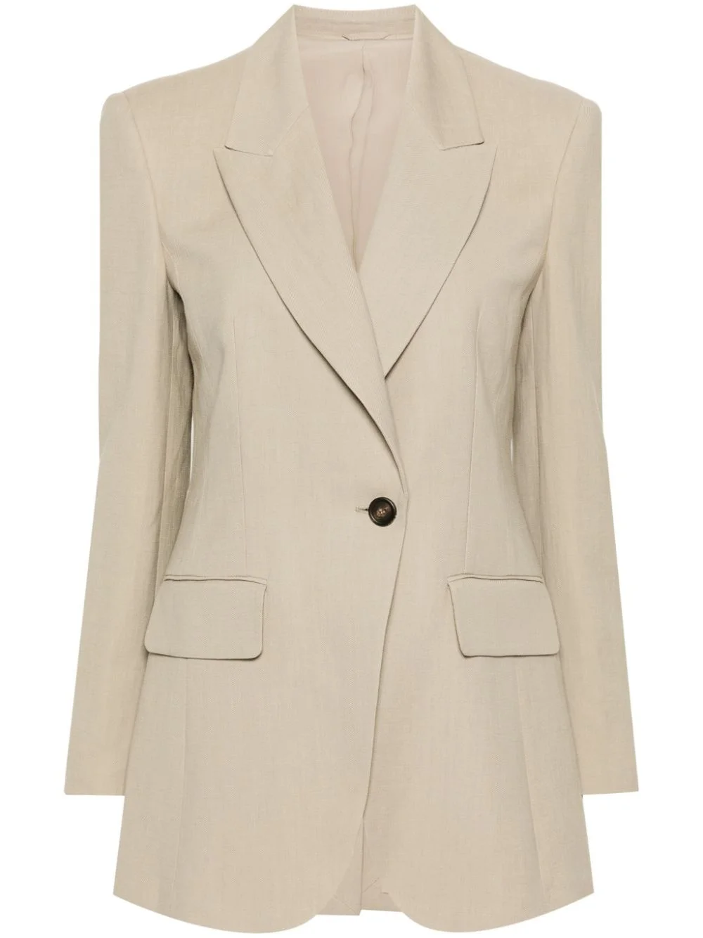 peak-lapels knitted blazer This blazer boasts a classic tailored design, nodding to Brunello Cucinelli's timeless style. It's imagined in a versatile beige hue and secures with a single button fastening. Highlights - Light beige - Knitted construction - Dart detailing - Peak lapels - Shoulder pads - Long sleeves - Buttoned cuffs - Two front flap pockets - American rear vent - Front button fastening - Full lining Made in Italy Composition Lining: Acetate 74%, Silk 26% Outer: Viscose 43%, Linen/Flax 27% SIZE & FIT Model measurements Height 5 ft 10 in(1.78 m) Bust/Chest 31.49 in(80 cm) Hips 37 in(94 cm) Waist 23.62 in(60 cm) FittingInformation Designed for a slim fit that sits just away from the body offering a close yet comfortable fit The internal shoulder pads offer a structured shape Made from a midweight non-stretch fabric This piece fits true to size – take your usual size