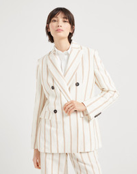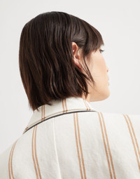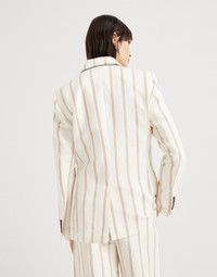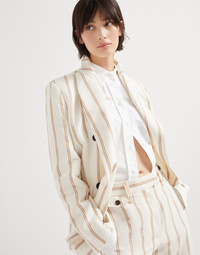 Linen and cotton panama reinterprets a timeless icon of classic style with a summery twist. The double regimental pinstripe pattern, inspired by formal menswear, meets the large peak lapels and horn buttons that characterize the double-breasted design, highlighting the feminine silhouette. The fit features slightly oversize shoulders, while the monili detail adds a subtle sparkling touch, in pure Brunello Cucinelli style. MATERIALS Cotton and linen Panama showcases a compact and fluid texture that brings to mind the distinctive “rustic” feel of summer canvas fabrics. DETAILS Horn button closure Half-lined in silk-blend crepe Peak lapel Chest pocket Hand pockets with flap Cuffs have four horn buttons Single back vent Nickel-free monili decoration 56% LINEN, 44% COTTON
