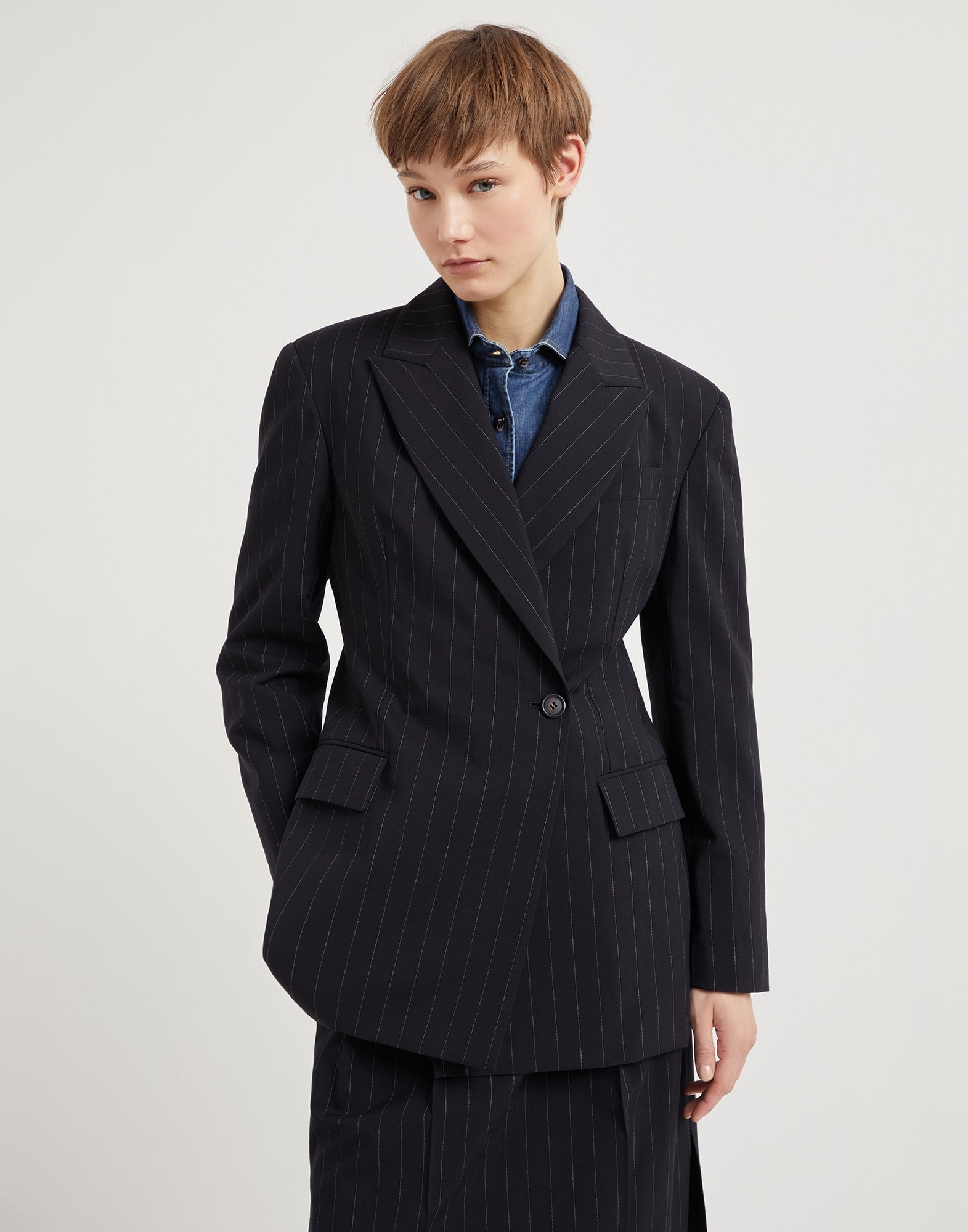 This virgin wool and cotton pinstripe blazer reinterprets a tailored classic in an elegant, contemporary way. The menswear-inspired striped pattern is paired with an essential silhouette, with tapered lines and a single-button side closure. A precious monili embroidery behind the neck completes the garment with a sparkling note in true Brunello Cucinelli style. MATERIALS The soft, lightweight texture of virgin wool and cotton showcases fine pinstripes, a classic pattern of tailored menswear-inspired fabrics. The light lining provides added comfort. DETAILS Horn button closure Half-lined in silk-blend crêpe Welt pockets with flap and chest pocket Cuffs have four horn buttons Single back vent Peak lapel Nickel-free monili decoration 60% VIRGIN WOOL, 40% COTTON
