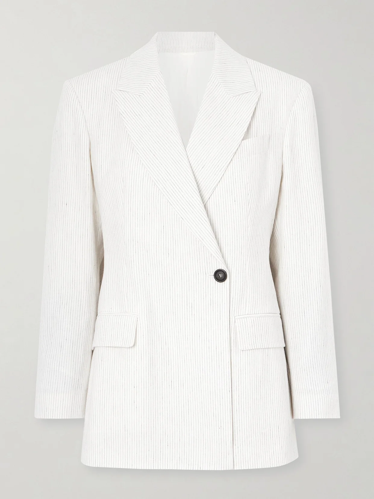 Brunello Cucinelli's blazer is part of a coordinating three-piece set with the matching vest and pants in our edit and looks just as chic with jeans or a midi skirt. It's made from a pinstriped linen-blend with plenty of soft cotton and has sharp peak lapels that draw the eye to the padded shoulders.