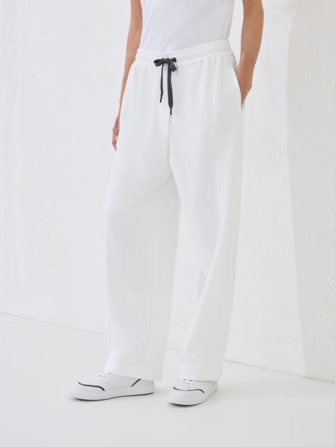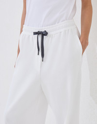 Refined Brunello Cucinelli materials are paired with the casual style of the Travelwear line, dedicated to moments of relaxation and leisure. Soft and versatile, these techno cotton pique track trousers marry refined materials and a sporty feel. The drawstring pull-on fit accentuates the relaxed silhouette, which is comfortable both in the seat and down the leg. MATERIALS Research on the finest materials elevates the sporty feel of cotton pique, a menswear-inspired fabric. The presence of a synthetic fiber makes the fabric comfortable, lightweight and extremely pleasant to wear. DETAILS Pull-up trousers with drawstring Front pockets Back welt pockets 93% COTTON, 7% NYLON