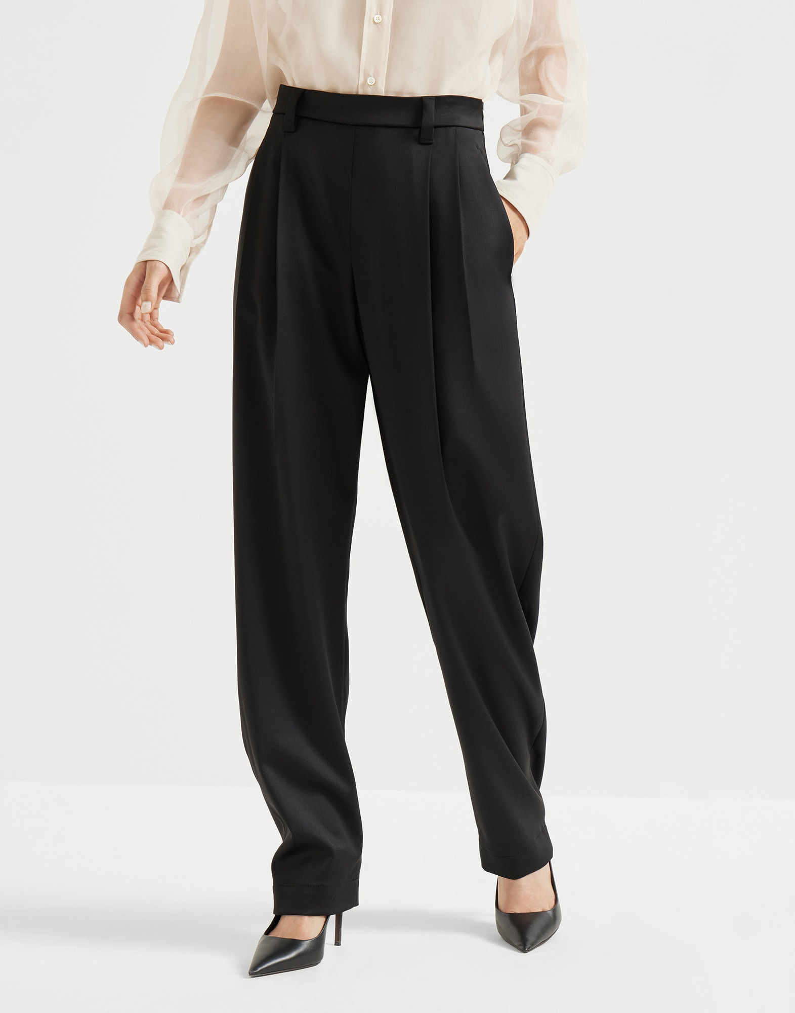 A relaxed attitude and tailored details define the style of these virgin wool stretch satin slouchy trousers. The fabric’s fluid texture complements the garment’s lines, which fall softly down the leg, tapering slightly at the ankle, creating a very subtle curve. Classic menswear elements such as the double pleats and rear welt pockets elevate the silhouette, while the iconic shiny monili embroidery completes the trousers with a feminine sparkle in true Brunello Cucinelli style. MATERIALS Virgin wool stretch satin is a fabric with inherent elegance, characterized by a smooth, silky hand. Resistant and warm, it is completed by a small percentage of elastic fiber which increases the garment’s comfort. DETAILS Side zip closure Slanted front pockets Double pleat Unlined Back welt pockets Nickel-free monili decoration 98% VIRGIN WOOL, 2% ELASTANE