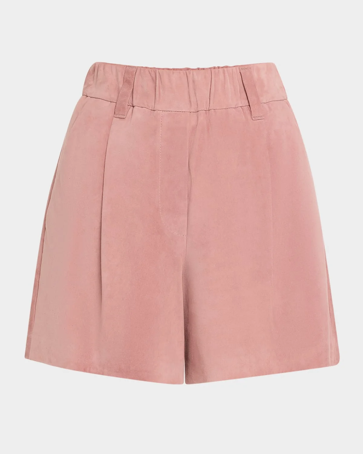 Brunello Cucinelli sheepskin suede shorts featuring a pleated front and elasticized wiastband Mid rise sits high on hip Angled side slip pockets; back welt pockets Wide legs Midthigh length Pullon style Leather Lining: Polyester/acetate Dry clean Made in Italy