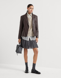 The light, slightly crisp look of virgin wool organza updates the classic style of this Mini skirt with a feminine touch. The pleated design is paired with an elastic waistband that gathers the volume, while the silk-blend crêpe lining completes the garment and helps to shield from the fabric’s subtle transparency. MATERIALS The new organza is a fabric with a light, impalpable effect. The mix of virgin wool with a synthetic fiber creates a dry, slightly crisp texture, which maintains the fabric’s pleated effect. DETAILS Pull-up skirt Silk-blend crêpe lining 55% POLYESTER, 45% VIRGIN WOOL