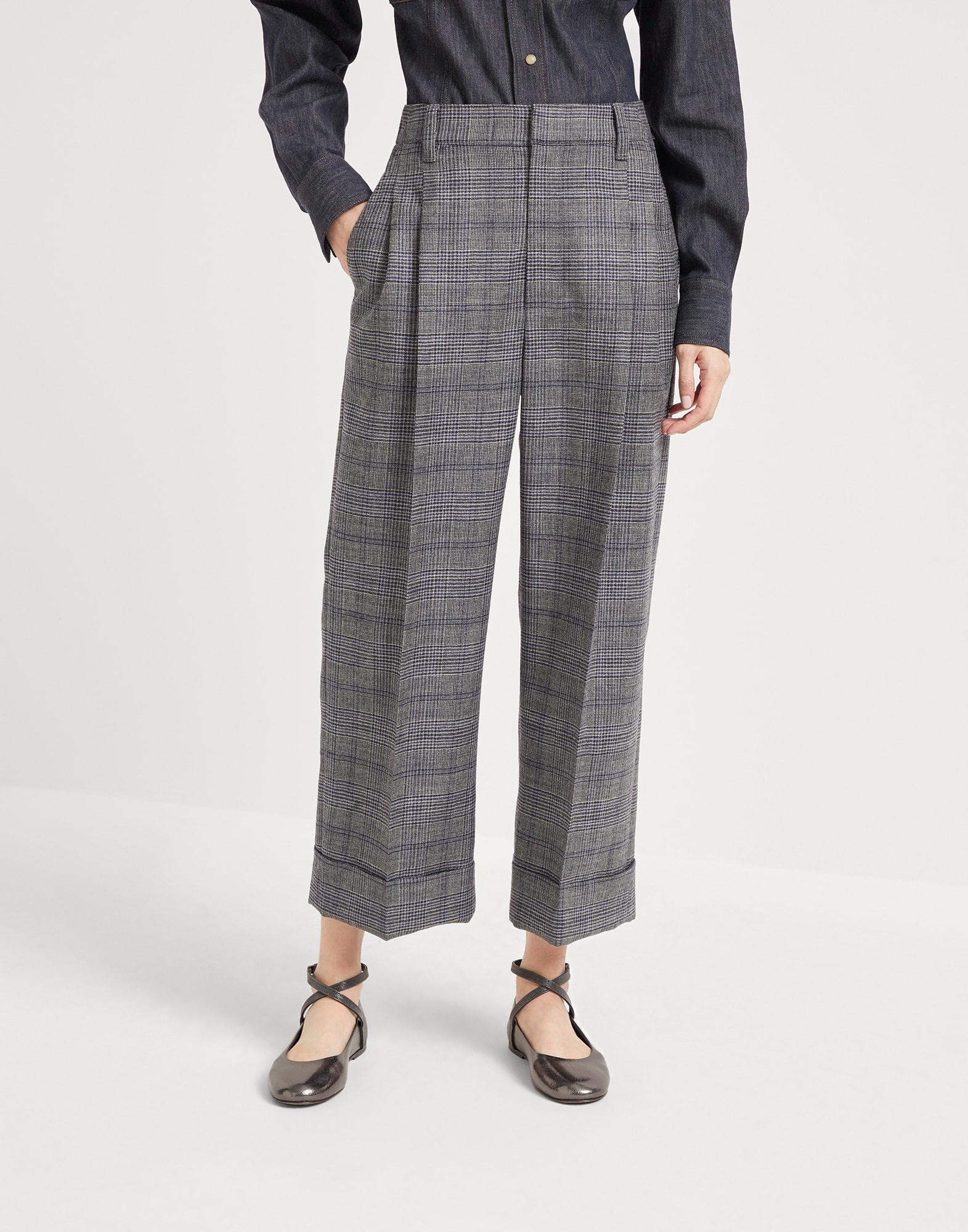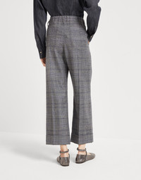 Tailored details meet timeless fabrics to create these cropped sartorial trousers. The double pleats stand out against the iconic Prince of Wales fabric, inspired by traditional British menswear, adding volume and structure at the top before turning into an impeccable ironed crease. The style features a boxy silhouette that ends in a cropped cut highlighted by a wide cuff, while an elastic band in the back offers added softness. The delicate shiny monili embroidery completes the trousers with a sparkling note in true Brunello Cucinelli style. MATERIALS The timeless Prince of Wales pattern and wool fibers, with a diameter of just 19 microns, combine sartorial tradition and high quality. The distinct pattern and the superior properties of virgin wool make this fabric the ideal choice for creating timeless garments. DETAILS Zip closure with metal hooks and backing button Slanted front pockets Double pleat Back welt pockets Rear elastic band Cuffed hem Unlined Nickel-free monili decoration 100% VIRGIN WOOL