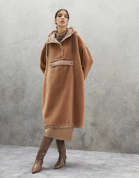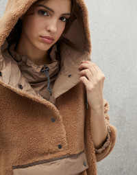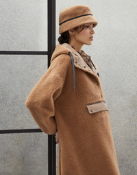 Refined materials and sporty details come together in this new outerwear jacket. The virgin wool and cashmere plush fabric gives the garment a soft, slightly full appearance, while the nylon lining adds a functional touch. A recurring detail of the season is added to the sporty details of the hood and large front pocket: a precious monili embroidery creates a shiny band that runs along the flap, completing the look of the piece with an iconic sparkle. MATERIALS The virgin wool and cashmere plush fabric showcases refined qualities: the noble virgin wool fibers create a texture with an extremely soft hand, while the cashmere fibers make the material cozy and comfortable. The full, slightly curly texture on the exterior is particularly warm, while the nylon lining provides added comfort. DETAILS Snap opening Drop shoulder Side zipper opening Adjustable drawstring hood Adjustable drawstring collar Front patch pocket Elastic cuffs Elasticized hem Water-resistant nylon lining Nickel-free monili decoration 72% VIRGIN WOOL, 20% NYLON, 8% CASHMERE