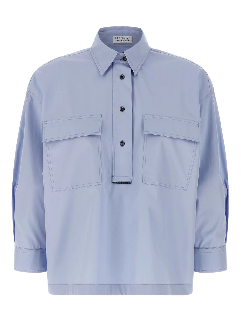 jewel-detail pocket shirt Highlights - Blue - Poplin texture - Polo-collar - Front button closure - Front jewel-detail - Half-sleeves - Cuffs Made in Italy Composition Cotton 100% Washing instructions Read Manufacturer Guidelines