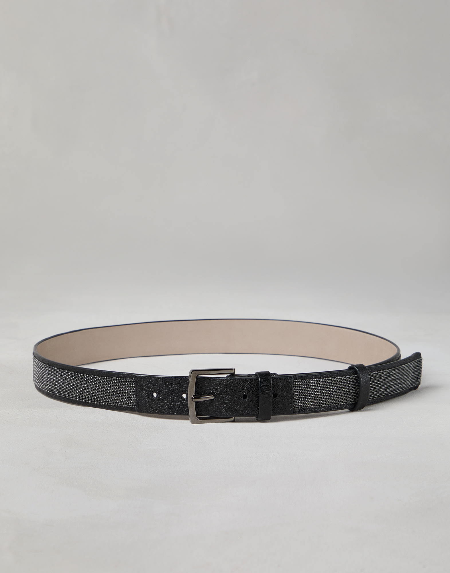 In true Brunello Cucinelli style, refined materials and embellishments enrich this new leather Precious belt. The premium leather is enriched with a band entirely embroidered with fine rows of shiny monili, creating a refined play of textures and reflections. MATERIALS Smooth and semi-polished, calfskin is paired with precious monili embroidery that adds a delicate sparkle and a texture contrast. DETAILS Nickel-free monili decoration Belt height approx. 3 cm (1,18") 100% REAL LEATHER