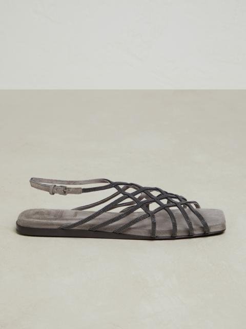 The iconic embellishment of the Brunello Cucinelli collections elevates the essential style of these slides. The wide suede bands are entirely embroidered in fine rows of shiny monili for an extremely precious, feminine effect. The footwear is characterized by a fine leather outsole with a square insole and rounded corners, while the back is slightly raised to provide added comfort. MATERIALS Refined suede is a compact leather with a soft, velvety texture. A leather lining and a rubber outsole provide added comfort. DETAILS Suede lining Leather sole TPU rubber tread Non-slip rubber insert Nickel-free monili decoration REAL LEATHER