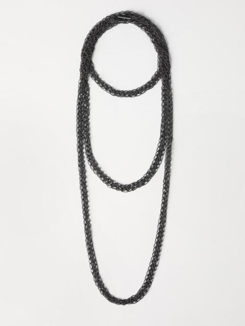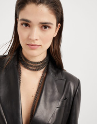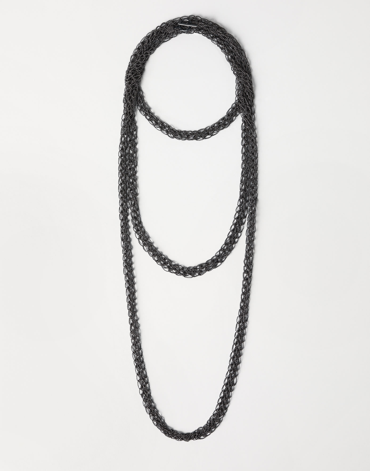 An elegant and very delicate design characterizes this new Precious Loops necklace. Made entirely of monili, the iconic embellishment of the Brunello Cucinelli collections, the necklace showcases small rings linked together, playing with sparkling overlapping and creating the look of several necklaces being worn at the same time. The hook closure completes the necklace with a functional detail. MATERIALS Monili, the iconic earmark of the Brunello Cucinelli collections, consists of fine rows of brass beads plated in different finishes. The faceted edge of the beads emphasizes the shiny tones of the monili. All of the metal components are covered with precious materials which completely replace Nickel, enriching the excellence of every single detail. DETAILS The maximum length of the open necklace measures approximately 230 cm (90.55") Hook closure Nickel-free monili decoration