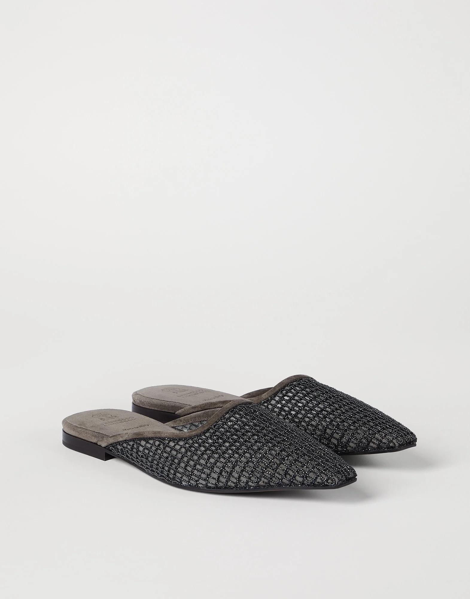 The season’s delicate embroidery enriches the essential silhouette of these suede precious net embroidery flats. Monili, the iconic embellishment of the Brunello Cucinelli collections, takes center stage in sophisticated net-like craftsmanship to create bejeweled footwear with a distinctly feminine feel. The design takes on a three-dimensional, airy and light appearance, emphasized by the sheen of the lurex thread, which provides an additional sparkling note. The suede trim and insole introduce an attractive material contrast. MATERIALS Precious strands of monili, held together by shimmering lurex thread, are used to create an irregular net-like appearance. The sophisticated workmanship gives the structure a solid yet fluid nature, thanks to the extraordinarily fine yarns. DETAILS Leather sole Non-slip TPU rubber at heel and toe Nickel-free monili decoration 100% REAL LEATHER
