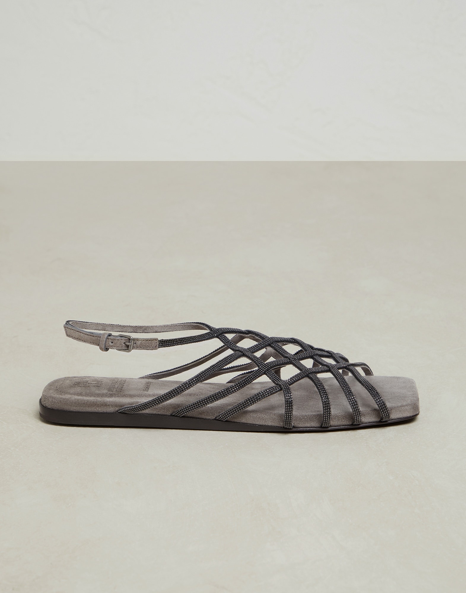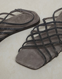 Sophisticated embellishments enrich the contemporary style of these Precious Net sandals with a sparkling touch. The soft suede lining is combined with thin straps fully embroidered in rows of delicate monili, which create a sophisticated net-like effect and enrich the light design of the footwear with the iconic embellishment of the Brunello Cucinelli collections. The leather outsole and the non-slip rubber inserts provide added comfort. MATERIALS Refined suede is a thin leather with a soft, velvety hand. The leather bottom with TPU rubber inserts provides added comfort. DETAILS Adjustable strap closure Suede lining Leather sole Non-slip TPU rubber at heel and toe Nickel-free monili decoration 100% REAL LEATHER