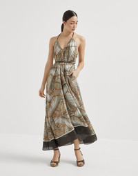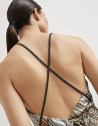This silk pongee dress updates a classic feminine fabric using an exotic pattern inspired by the beauty of nature. The season’s new papyrus print stands out on the light, sinuous fabric, recreating delicate papyrus leaves in a stylized way. Two straps embroidered in shiny monili tie behind the neck to delicately hug the waist, completing the design with the iconic style of the Brunello Cucinelli collections. MATERIALS Pure silk pongee is refined fabric characterized by a fluid texture and a semi-glossy appearance. The fabric is printed with a design inspired by the leaves of the papyrus plant in the season’s colors. DETAILS Strapless neckline Half-lined in silk-blend crepe Band tied at the neck and waist Hand pockets Nickel-free monili decoration 100% SILK